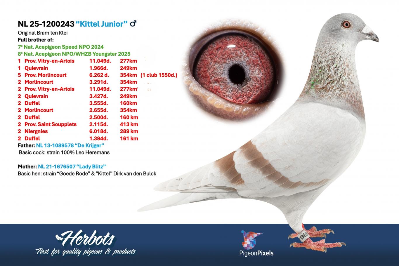 The combination brings together the best genes of M.F.J. Krijger and the world-famous BLITZ line of A.J. Roording, thereby combining the very best of Dirk van den Bulck, Kittel, Goede Rode, and Leo Heremans.