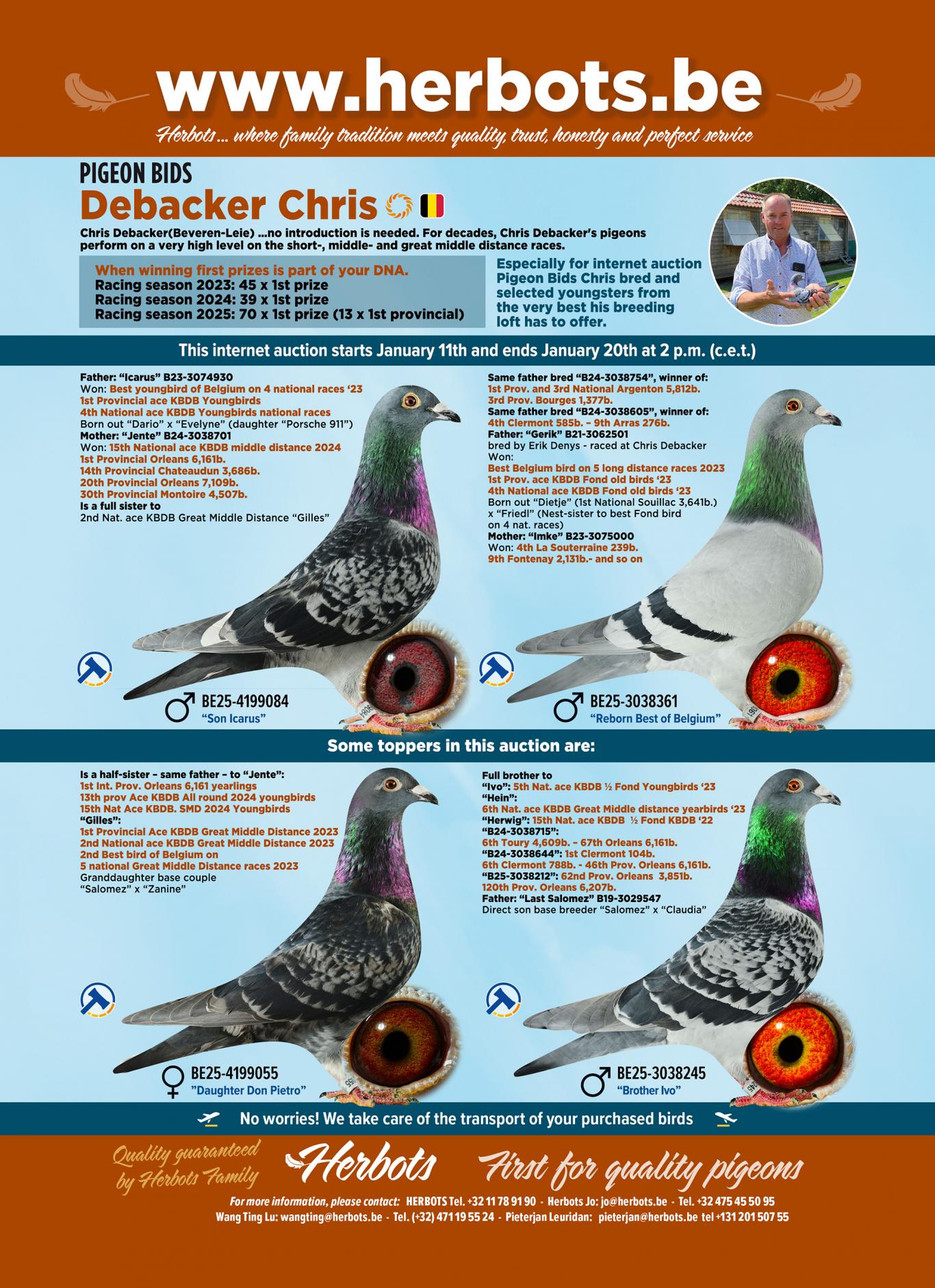 For several years now, many have recognized the value of Chris's pigeon family and have strengthened their lofts with these pigeons. The list is very long, but feel free to ask Jelle Roziers (Berlaar), Rik Cools (Ruiselede), Annick Goeteyn (Deinze), Anthony Maes (Waregem), Gommaire Verbruggen (Scherpenheuvel), etc., about the impact the Chris Debacker pigeons had on their lofts.