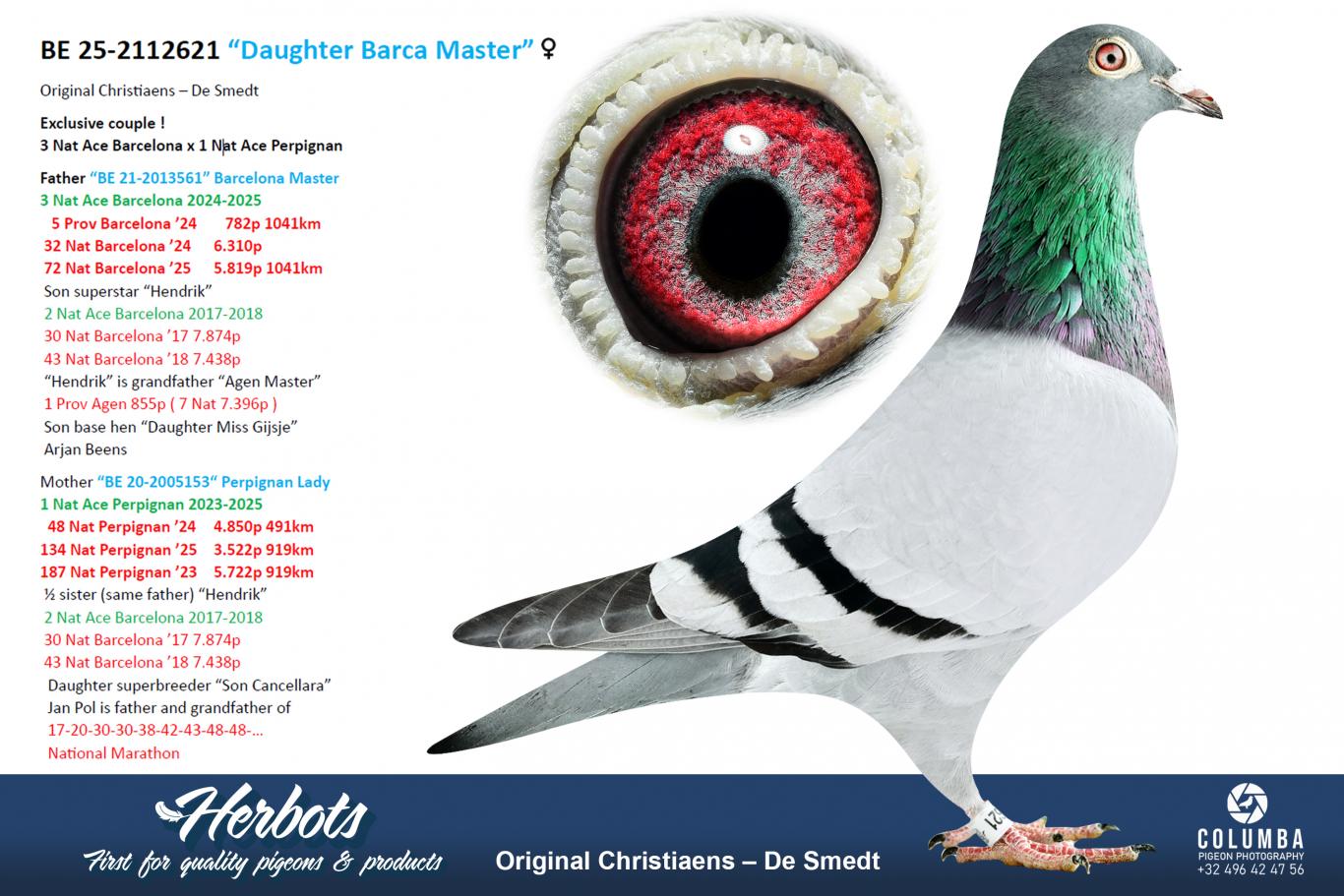 Daughter of "861/13" Grandson 2nd Nat. Barcelona Claire x "947/13" 3rd Nat. Ace Pigeon Barcelona 2016-2019 with, among others, 90th, 170th, and 178th Nat. Barcelona and 25th Nat. Marseille