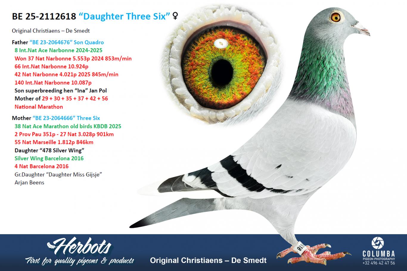 A daughter of “Son Quadro” 8 Int.Nat Ace Pigeon Narbonne 2024-2025 x “Three Six” 38 Nat Ace Pigeon extreme long distance old KBDB 2025