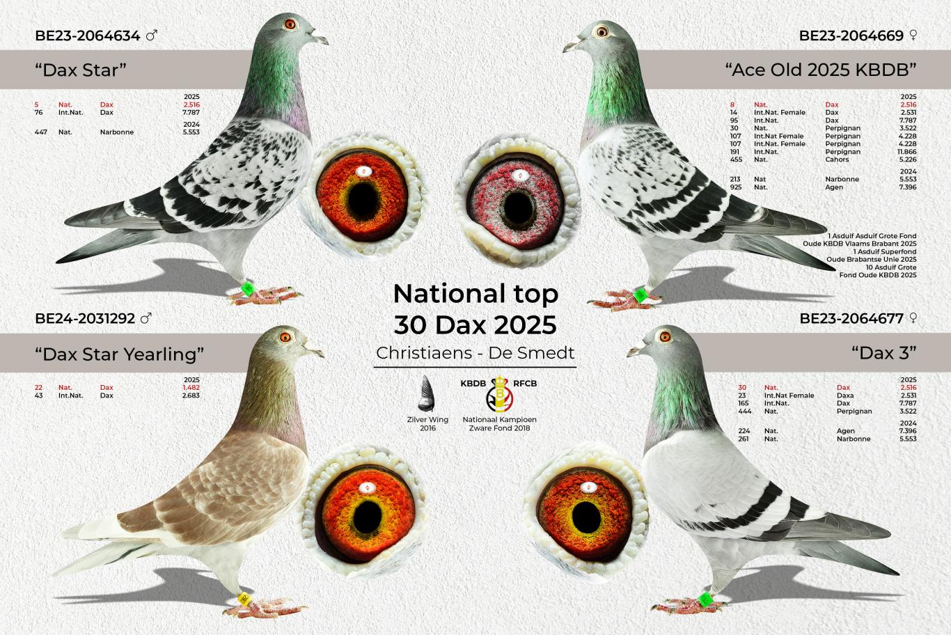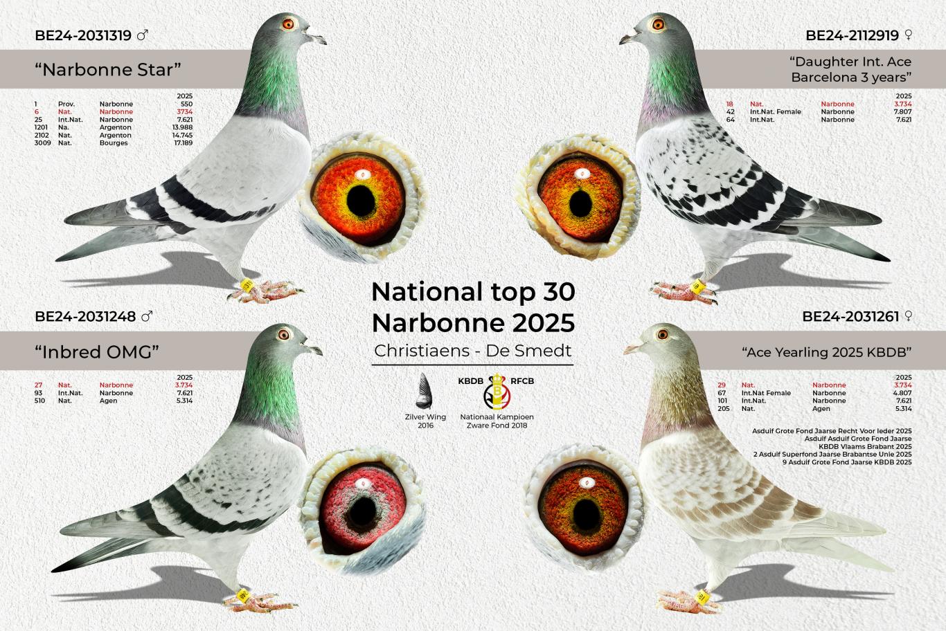 Other top birds of the 2025 season that took this colony to the next level. "Daughter Ina" won 9th National Ace Pigeon Extreme Long Distance Yearlings KBDB 2025 and is a daughter of "Daughter Cancellara" Jan Pol. "Dax Star" won 5th National Dax against 2,516 pigeons in a very demanding race. "Son Quadro" won 37th and 42nd National Narbonne in 2024-2025 and finished 8th National Ace Pigeon over these two races. "Three Six," a hen, won 27th National Pau and 55th National Marseille and finished 38th National Ace Pigeon Extreme Long Distance KBDB.