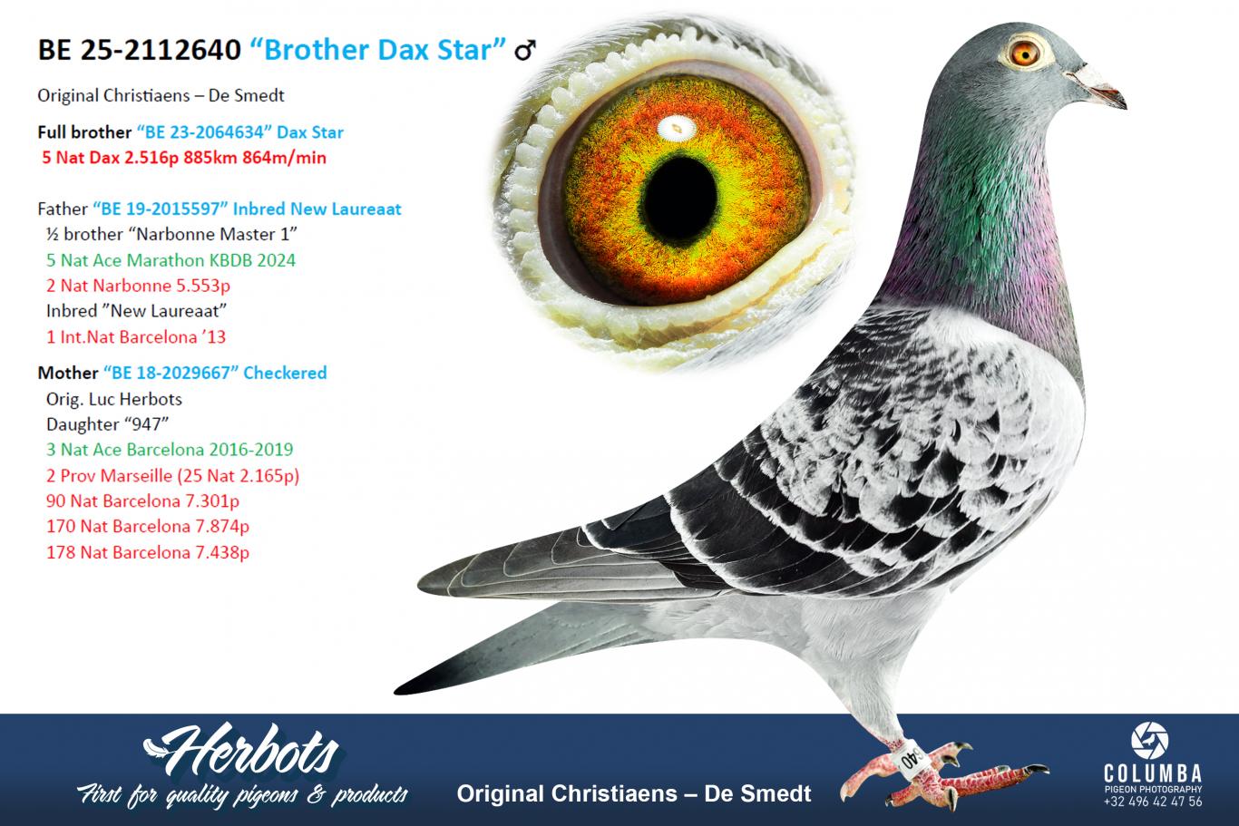 This is a full brother of top racer "Dax Star" 5th Nat Dax 2,516 p. This is a cross from the line of "New Laureaat" 1st Int.Nat Barcelona x Luc Herbots