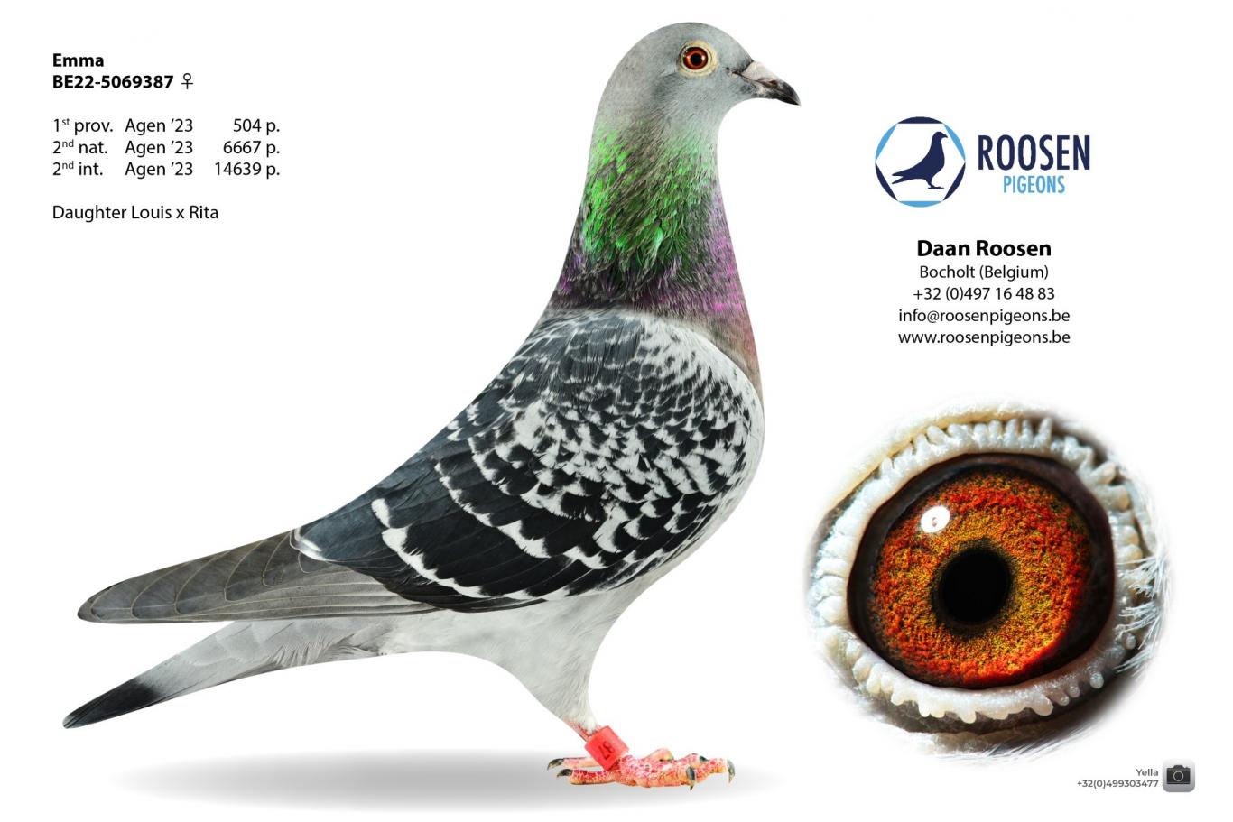 Daan enthusiastically continues the conversation: “One of my best pigeons is Rita, herself winner of 1st Provincial Ace Pigeon Extreme Long Distance 2019 and 2nd National Marseille. She already has several youngsters that fly early, including Emma (mother of lot 3), 2nd International Agen 2023.
