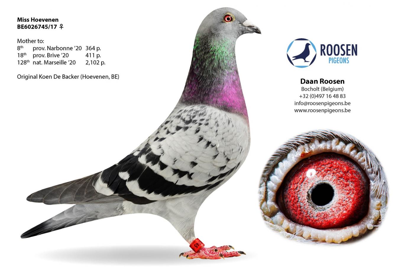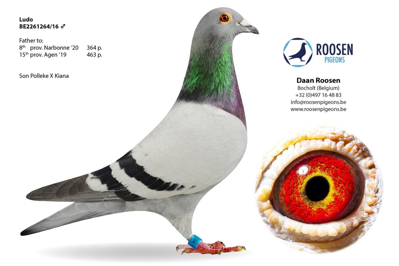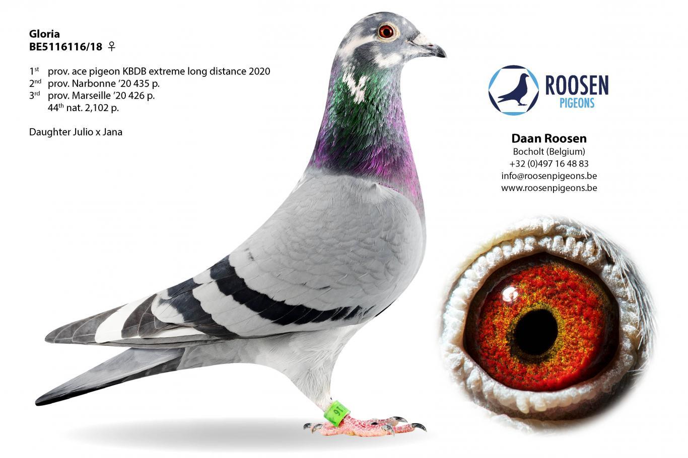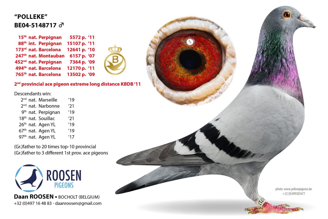 Daan Roosen was born with a passion for marathon racing. A passion he inherited from his grandfather, Arthur Machiels. His "Polleke" was a superior champion. The kind of guy who doesn't have the word "failure" in his vocabulary. "Polleke" was more than a fixture in grandfather Arthur's racing team, and grandson Daan certainly noticed. During his career, "Polleke" won several top prizes in Barcelona, Perpignan, and Montauban, but most impressively, at the age of seven, he won 15th National Perpignan against 5,572 pigeons and, at the end of the season, was crowned 2nd Provincial Ace Pigeon Extreme Long Distance KBDB.
