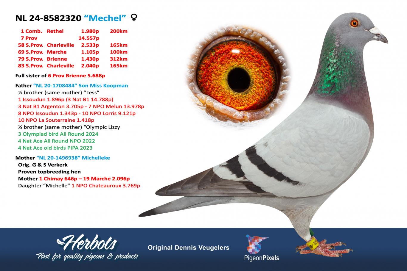 She herself has amassed an impressive palmares, winning two 1st NPO prizes against 6,300 and 11,600 pigeons. A wonder hen in the air, and now also in the breeding loft. She also immediately became the mother and grandmother of several top pigeons
