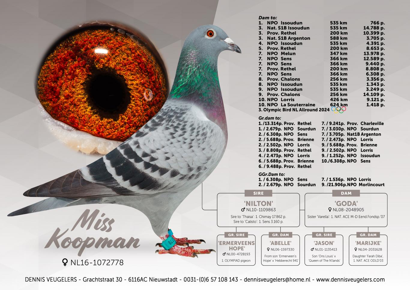 Deze topduivin is opnieuw een dochter van superkweekduivin “Miss Koopman” en heeft een palmares om U tegen te zeggen.