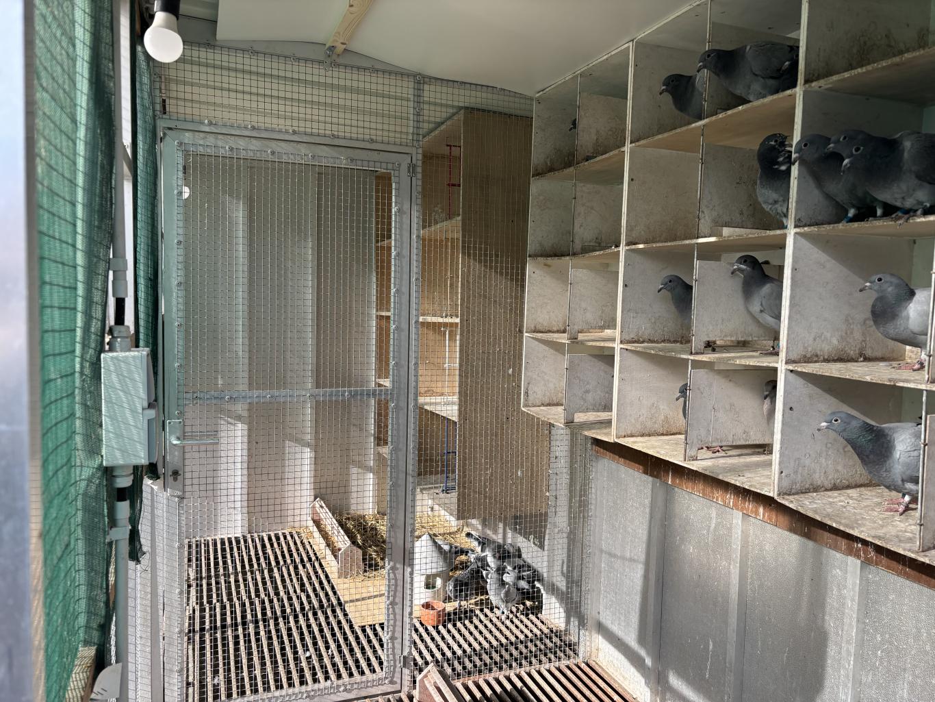 His current team consists of twelve cocks and seven hens. Each pigeon has its partner at home, but he doesn't breed with the racing pigeons. Pairing begins in early March, with the first releases around March 15th. He lets the pigeons brood for about ten days and then begins his season with the hens. The ten breeding pairs were paired on December 6th to produce early-maturing youngsters. Currently, there are about thirty youngsters in the lofts, with the goal of reaching forty. They are led in through a sliding door and will be kept in the dark. His goal is clear: to have them participate as much as possible, including in national competitions, to gain experience and to be able to apply a strict selection procedure.