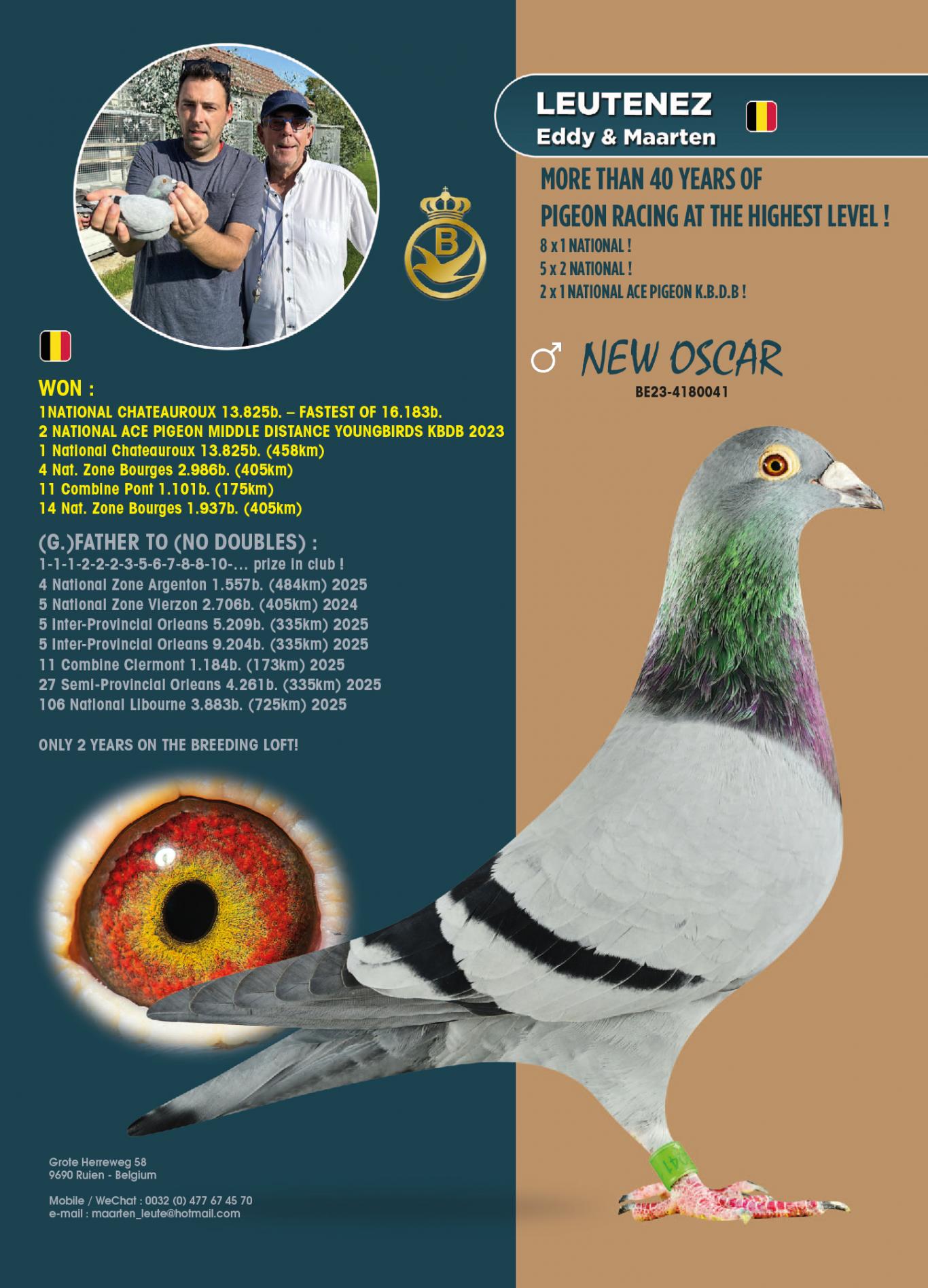 The sire of the 1st prize Peine 1,164 p. and 1st Trebbin 2,850 p. @ lepuch I.K.D. (Poland) is an original Eddy and Maarten Leutenez cock – a half-brother of "Alaphilippe." And in 2025, this fancier will win 2 x 1st Ace Pigeon Club Long Distance. and this with grandchildren of "Oscar"