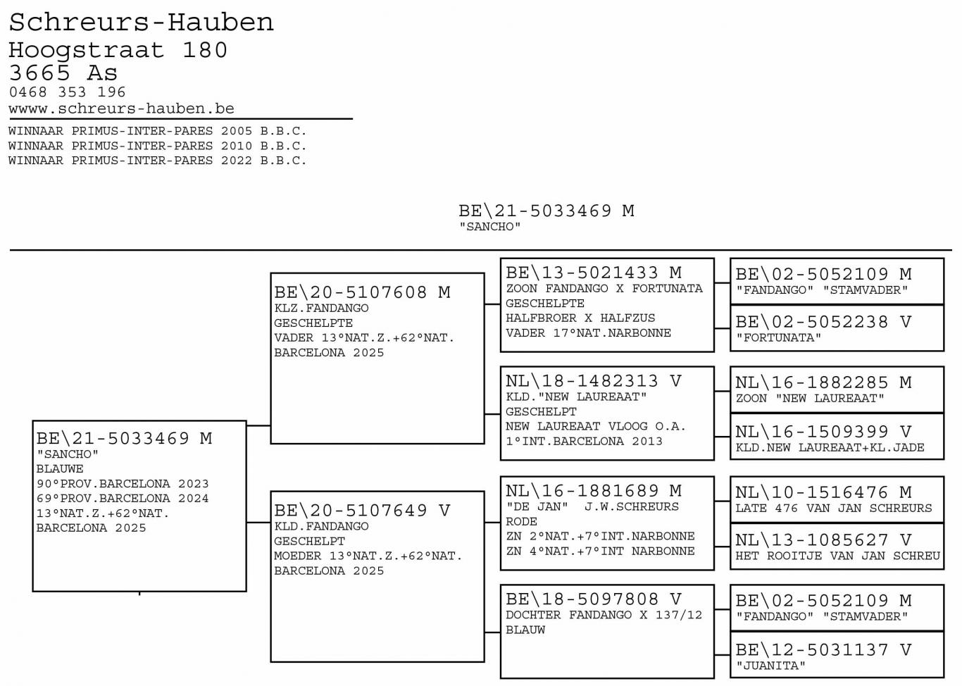 Son of "433/13" son of base breeder Fandango x "NL 213/18" Granddaughter of New Laureaat 1st International National Barcelona Luc Wiels and super breeder at Batenburg-Van de Merwe.