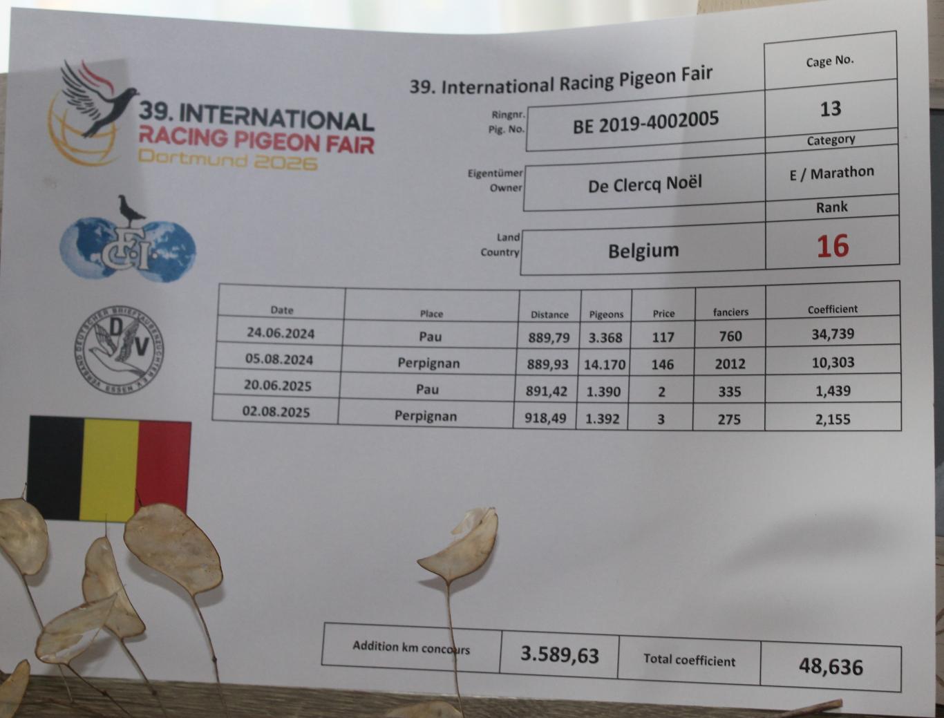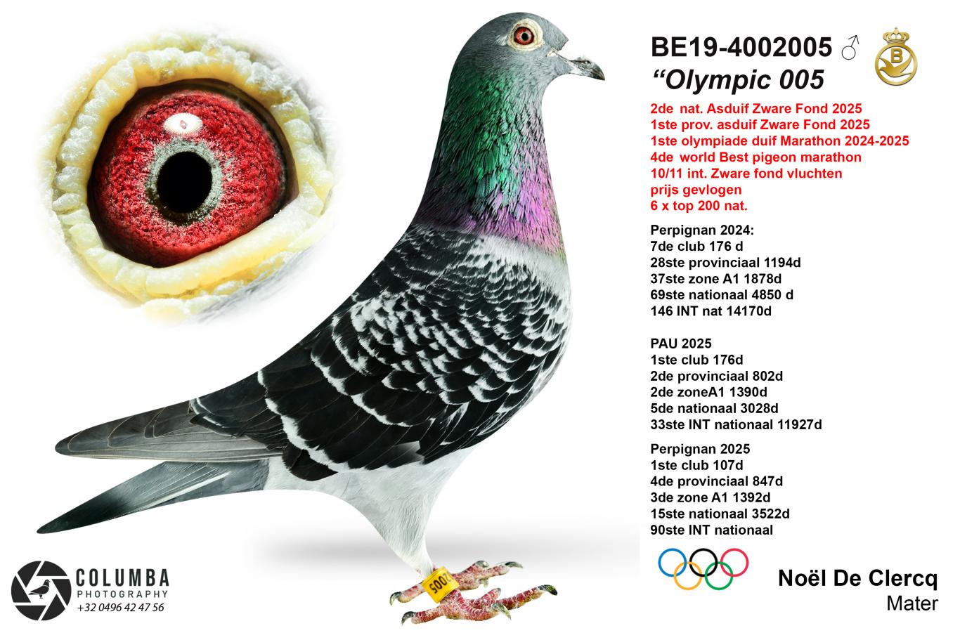 The dark chequer cock with ring number BE19-4002005 was first called 005 after his strong performances, but after his Olympiad title he was officially renamed Olympic 005. He is a medium-sized pigeon, not big, with strong muscles, soft feathers and a well-pigmented eye. A very beautiful pigeon. Also a bit nervous. He had the privilege to develop calmly in his youth. Little or no racing as a youngster, then normal races up to 500 km as a yearling. He was only tested on extreme long distance at 3 years old. That extra year proved beneficial. Out of 10 extreme long-distance races, he missed only one. After that he was present 9 times, often very early in the results. With as highlights 2nd national ace pigeon and 1st Belgian Olympiad pigeon. Noël also added that in Perpignan 2026 the 005 lost time on arrival for the first time. He circled the house a few times before entering. Was it the joy of returning or satisfaction of the performance? No one will know. The difference with the first ace pigeon was very small. Such is life… His record remains outstanding. The CV of Olympic 005 looks impressive.