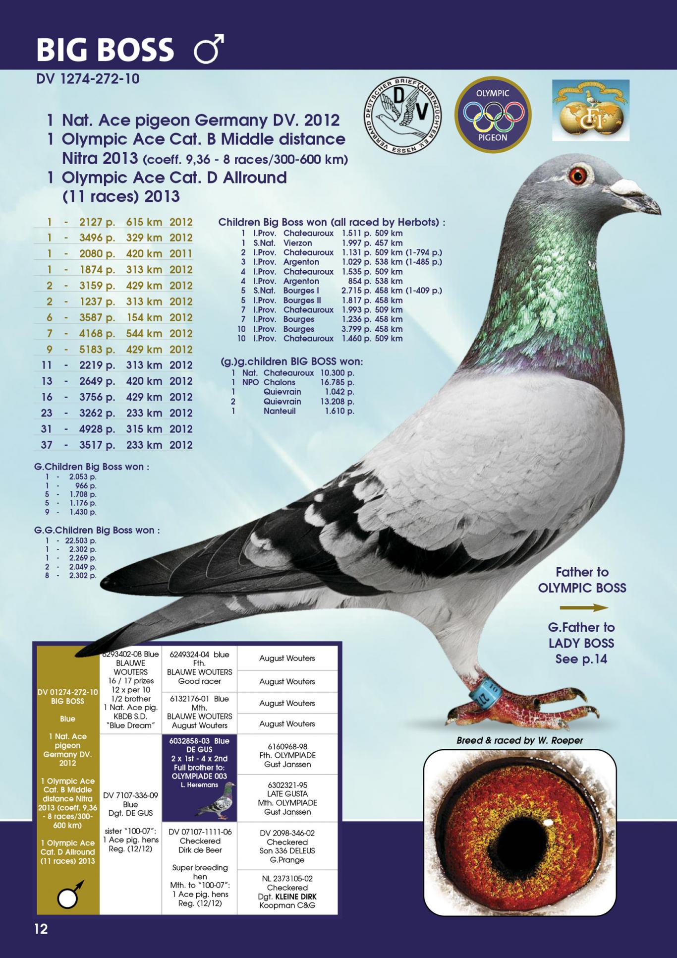 Ring number DV01274-10-272” … owner of this top pigeon… Wolfgang Roeper. A few minutes later, Jo was already talking to Wolfgang, and the deal was sealed. A few days later, “Der 272” was already in the breeding loft in Halle-Booienhoven and was renamed “Big Boss.”“Big Boss” developed into a true top breeder.