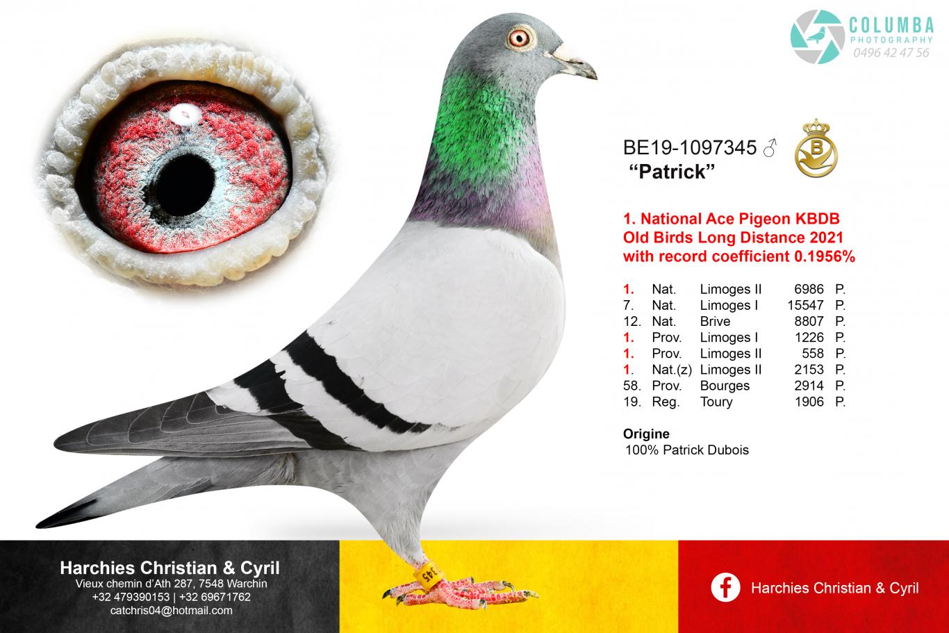 2. On his mother's side, we find a sister of 'Patrick', another champion, bred by Patrick Dubois and raced by Christian & Cyril Harchies (Warchin). With this pigeon, he won the 12th National Brive (8,807 p.) in 2021, the 7th National Limoges I (15,547 p.), and concluded his season in style with the 1st National Limoges II (6,986 p.), becoming 1st National Ace Pigeon Long Distance KBDB 2021, with a record coefficient of 0.1956%, an unprecedented achievement.