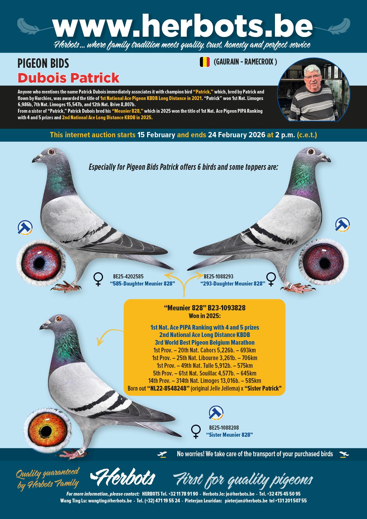 Last season 2025, was special and exceptional for Patrick Dubois, because despite his health problems (hip surgery and cancer treatment), he won the Herbots Championship "Old Pigeons/Yearlings (Wallonia)" and, as if that wasn't enough, his pigeon "Meunier 828” - BE23-1093828 - was named "2nd National Ace Pigeon Long Distance KBDB 2025", and also achieved "1st place in the PIPA ranking" as best old pigeon in the long distance races with 4 and 5 prizes.