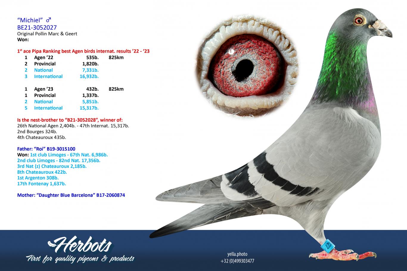 The clearest proof that "Michiel" was born into a winning family is the fact that his nest brother "B21-3052028" also achieved top results with his ring number.