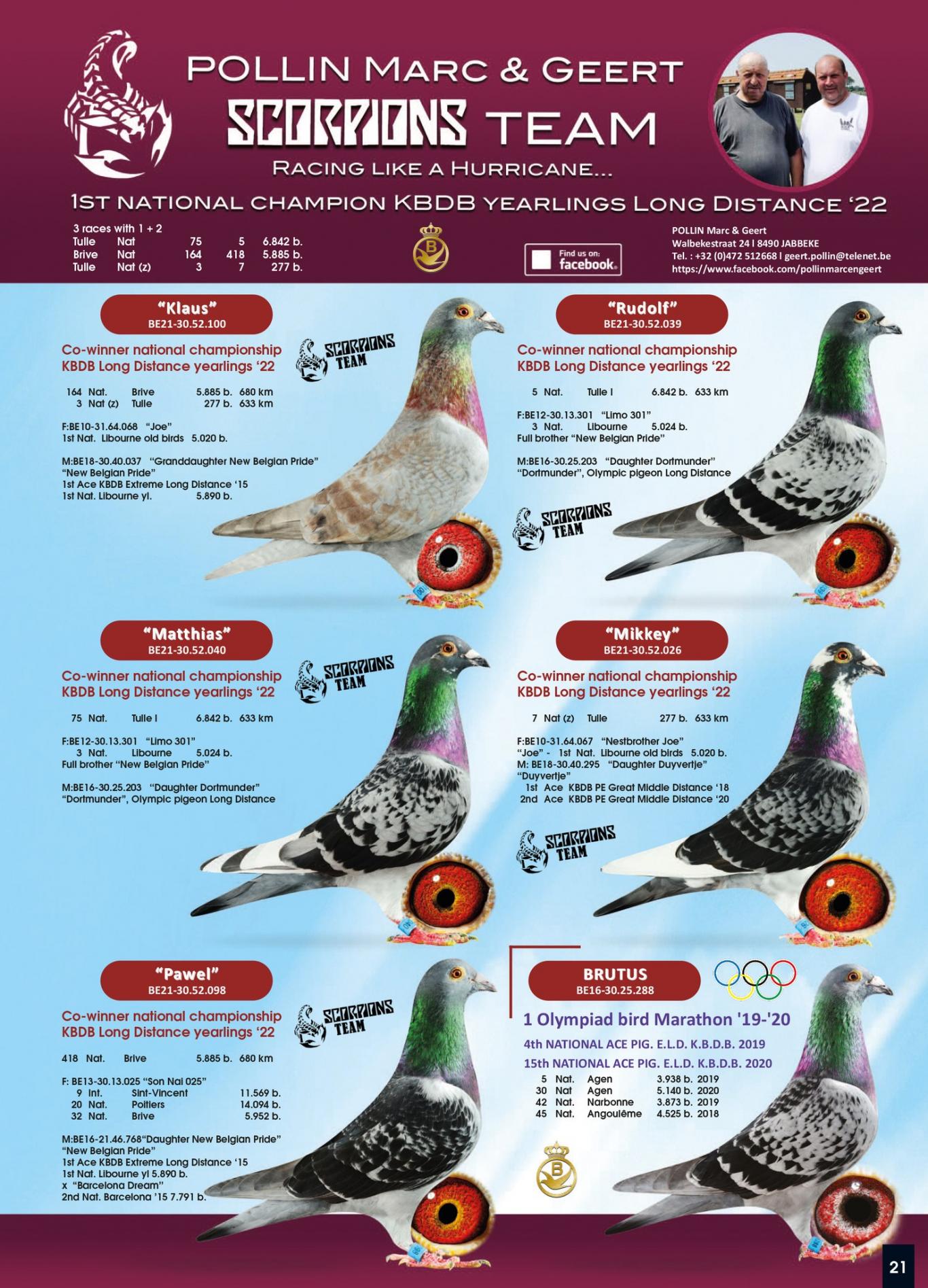 If we have to describe the last 5 or 6 years, we see that, under the impetus of Geert Pollin, Marc and Geert's strategy also adopted the path of One-Loft Races. While the Pollin pigeons continued to perform at a high level in Snellegem, they also scored top marks in various One-Loft Races. But first, there's the outstanding performance of "Michiel" and the "Scorpions Team."