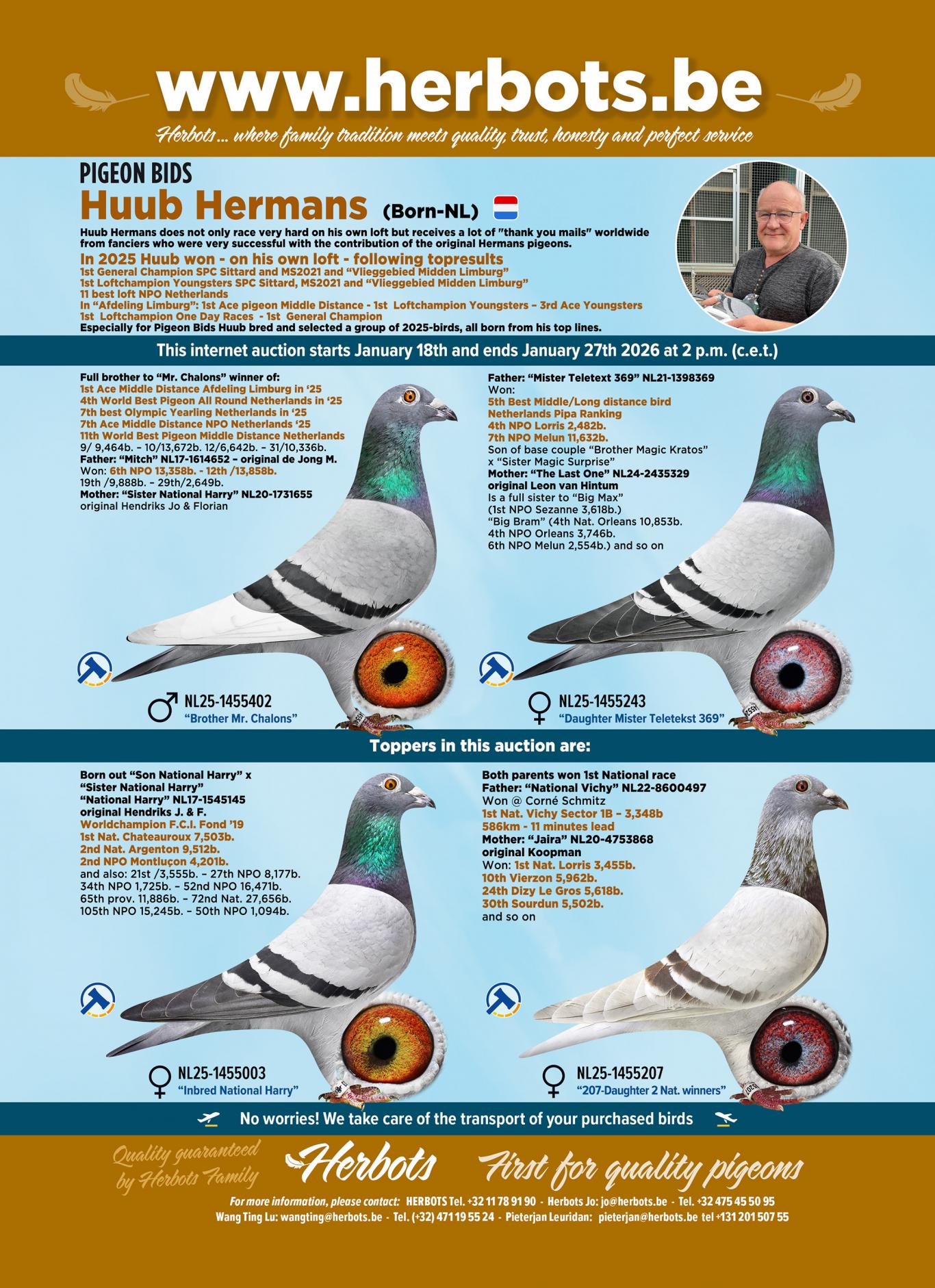 On internet auction Pigeon Bids Huub offers a select group of topbirds all born out his famous breeders
