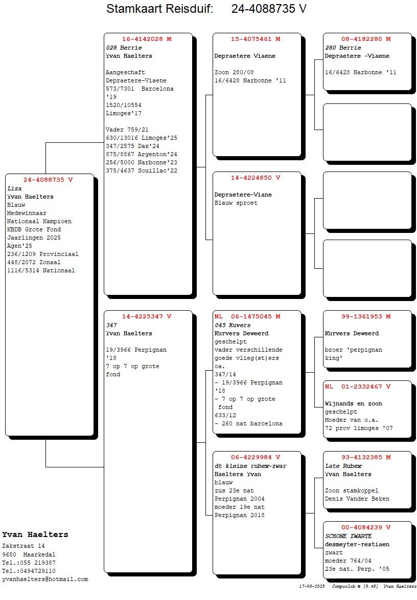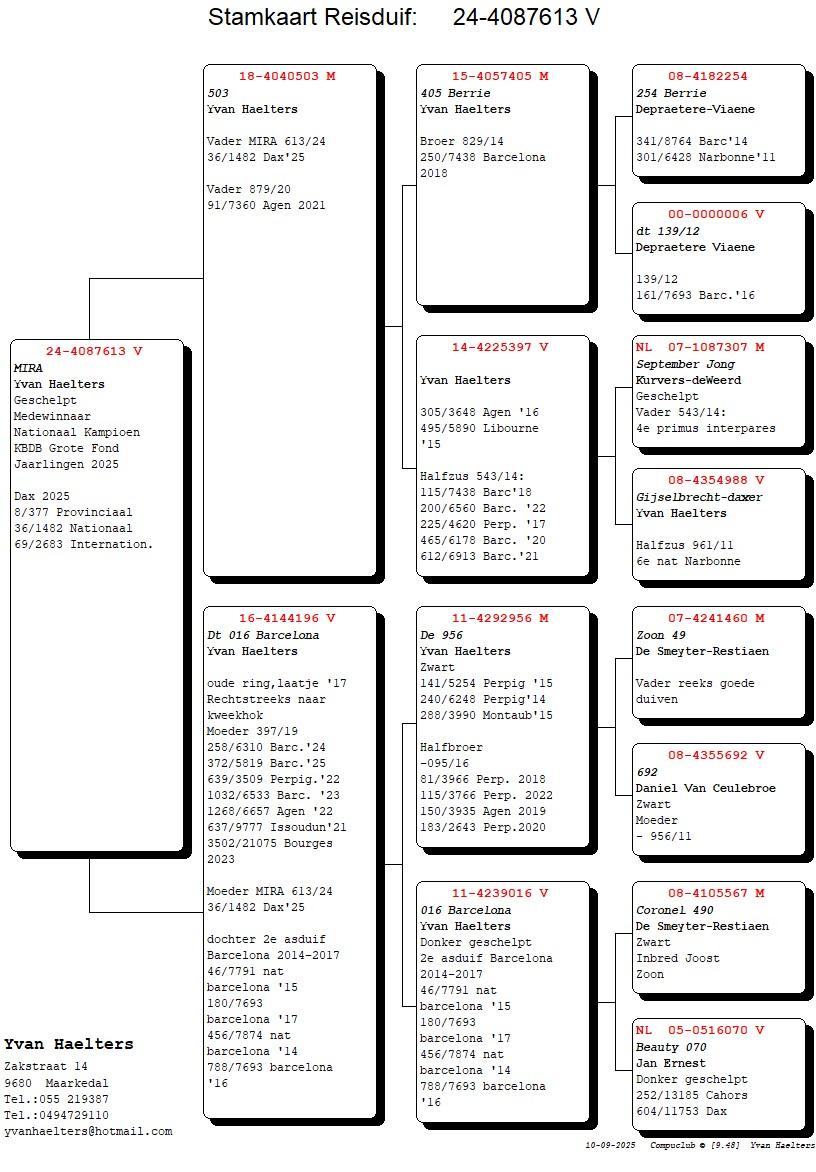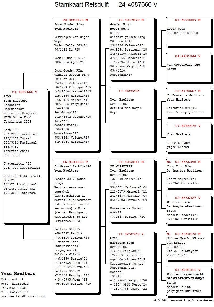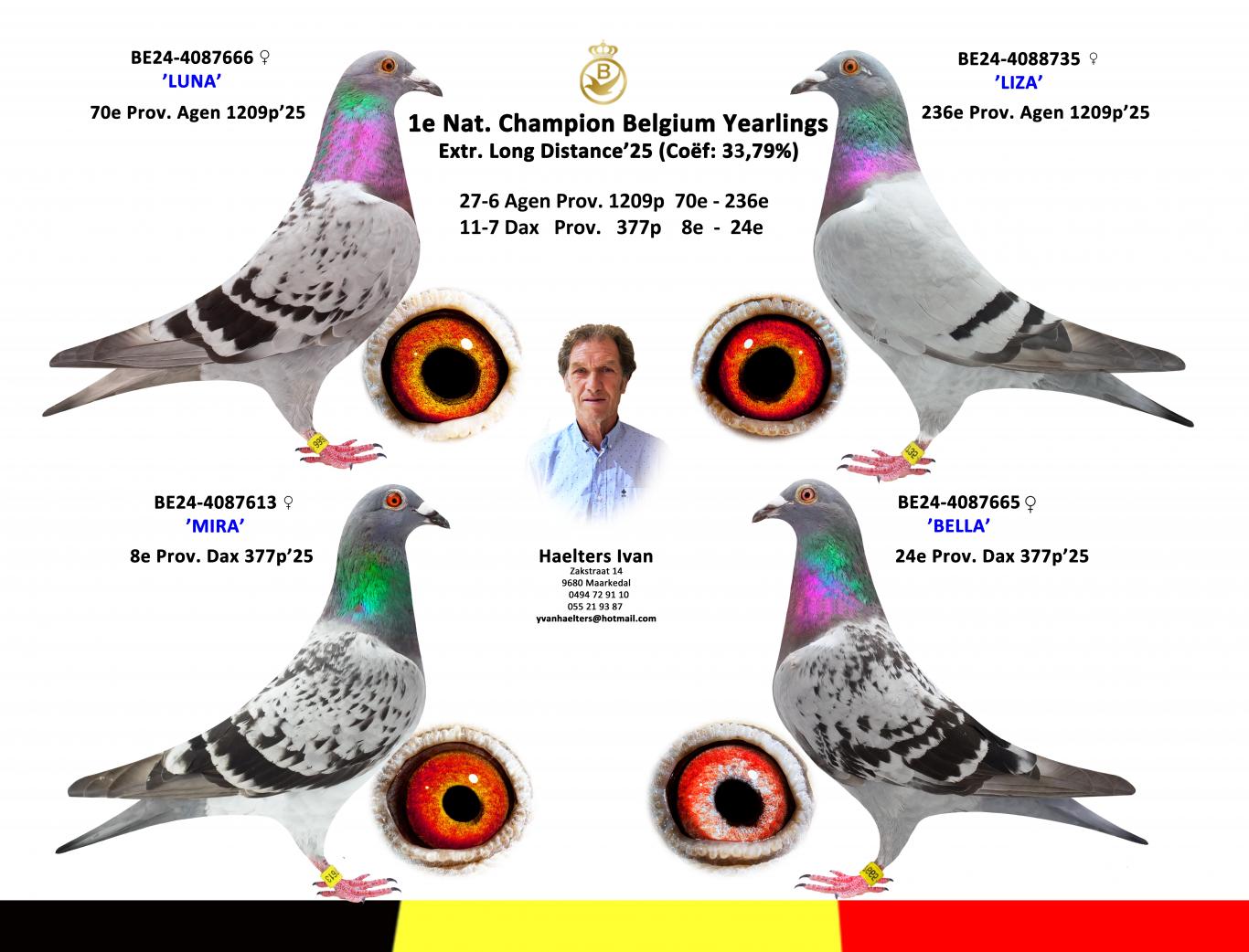 She was paired to Mira and also bred. She also performed in the top 100 nationally. Her lineage, on her father's side, is a son of Gouden Ring Waasland from Roger Weyn (who also owned pigeons from Yvan) paired to a daughter of Marseille (12th national Marseille), who in turn was paired to Milo (4th national Perpignan). A lineage peppered with top national pigeons, each of which has proven capable of handling the toughest races.