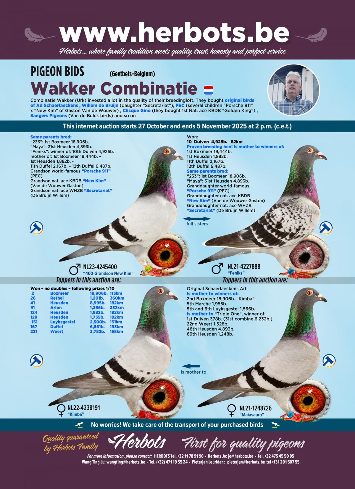 In this auction Combinatie Wakker offers children out these champion breeders, combined with some top winning birds such as "Kimba" (2nd/18,906b. - 41st/8,995b.)