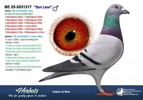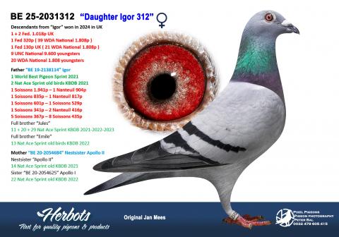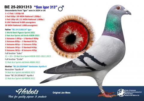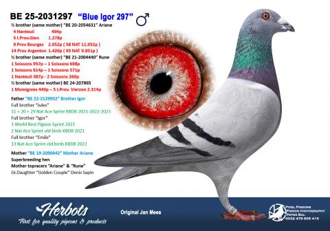 Included in this auction: Children from superstar "Igor" and children of national ace pigeons KBDB "Apollo II" - "Joppe" - "Emile" - "Apollo I" - "Jules."