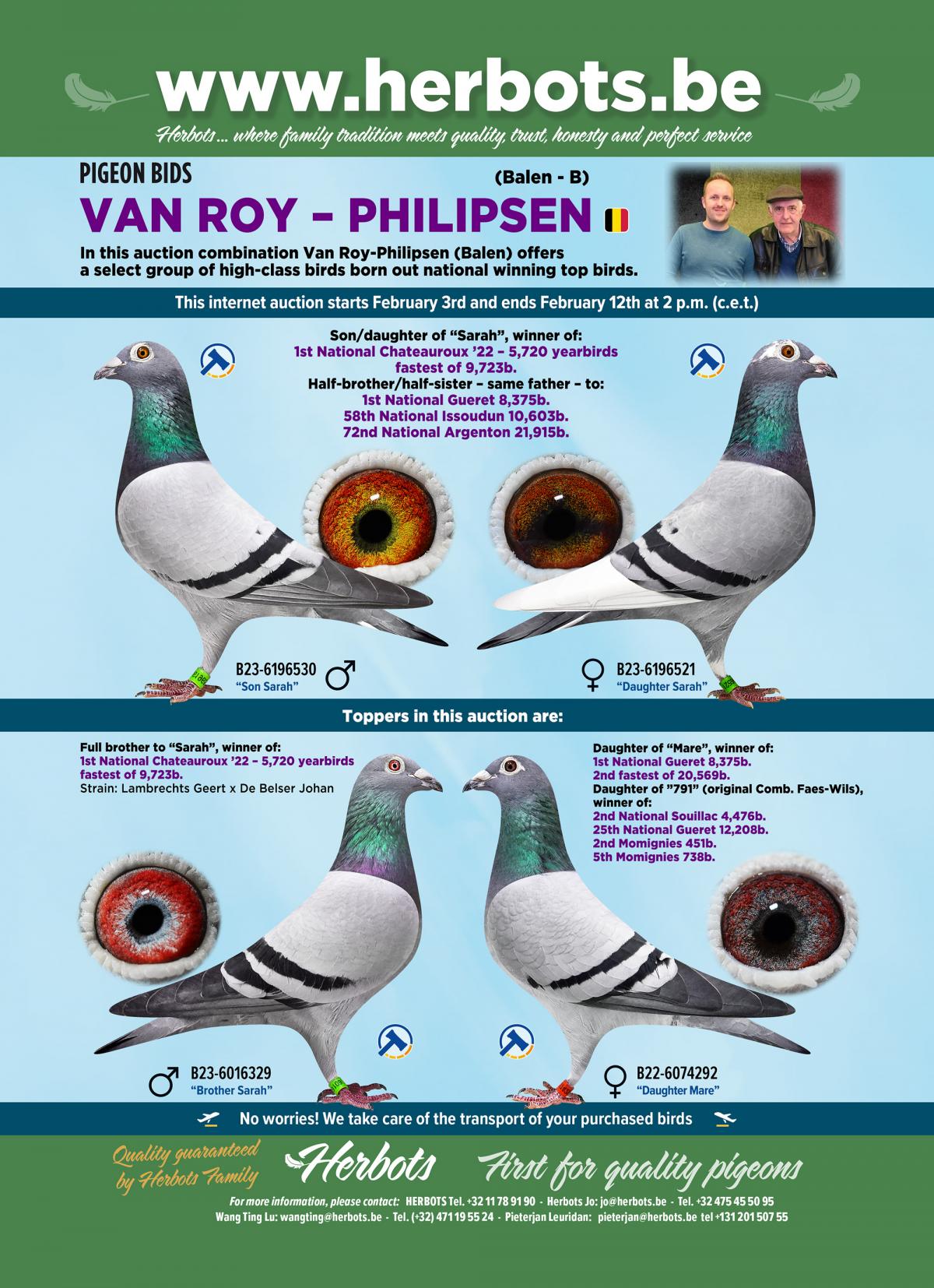 In this auction combination Van Roy-Philipsen (Balen) offers a select group of high class birds born out: