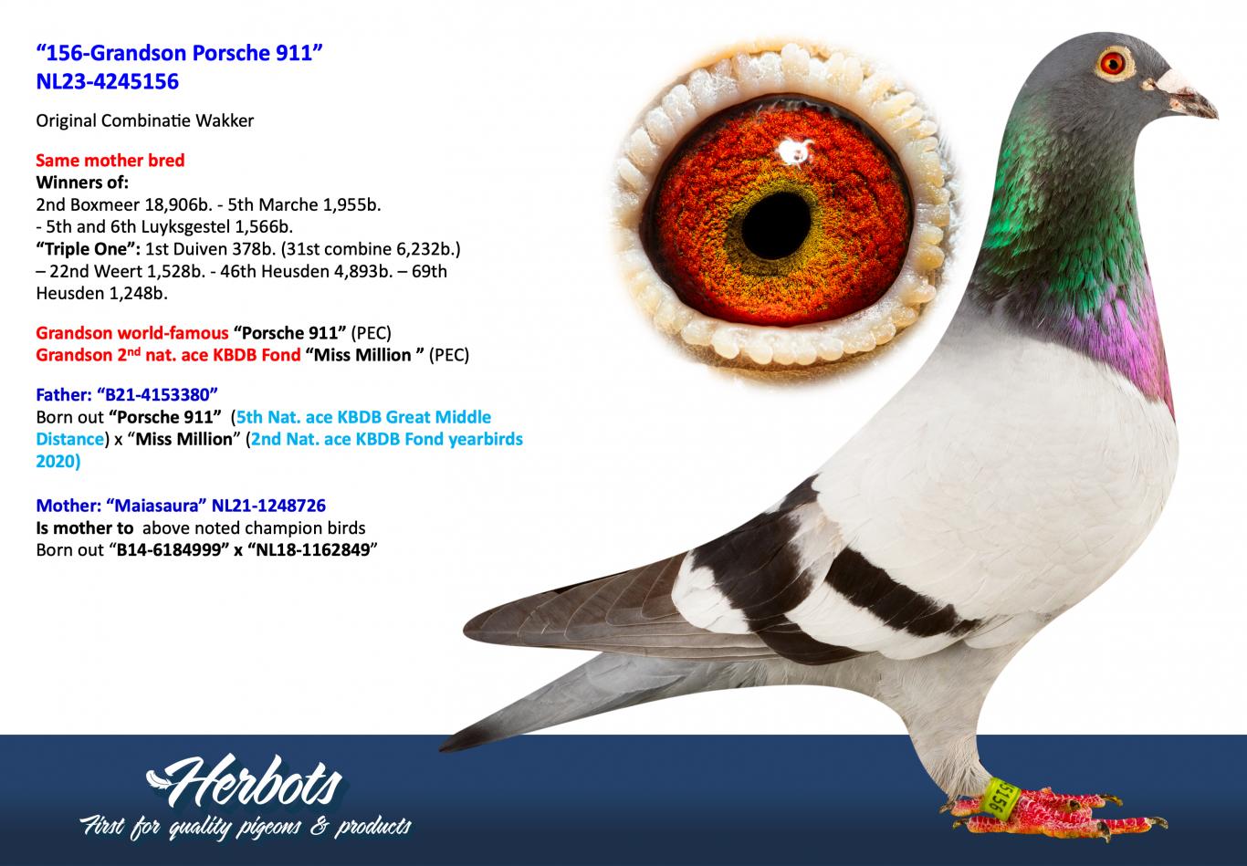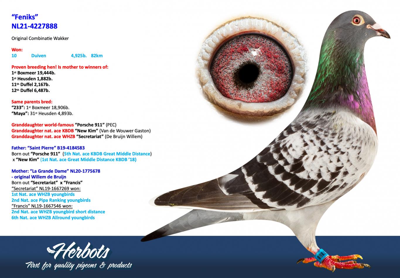 "Saint Pierre" B19-4184583 is a direct son of two world-famous pigeons, namely "Porsche 911" x "New Kim."