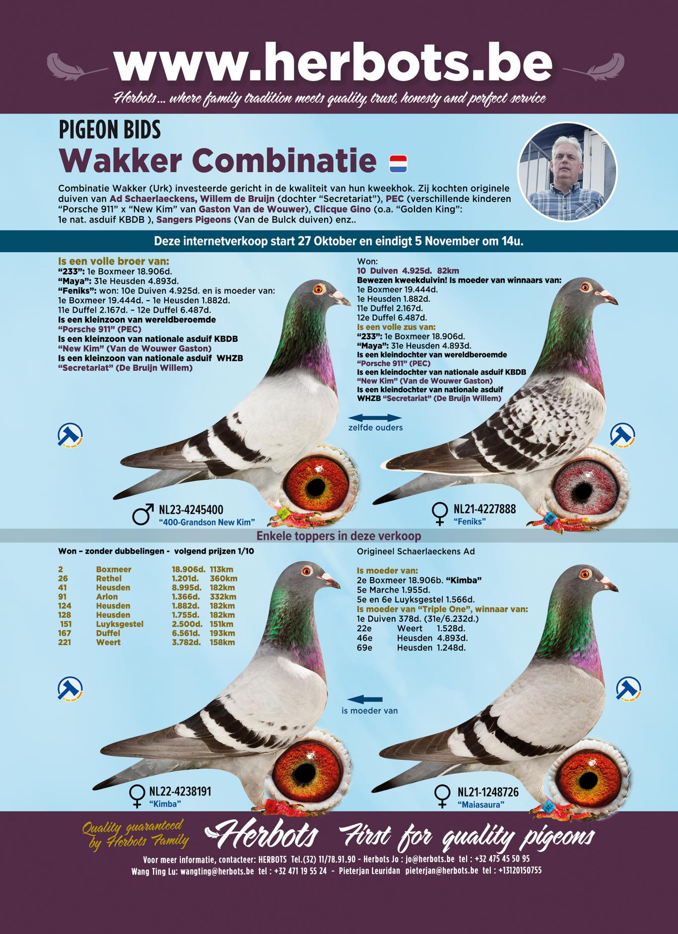 One auction we'd like to draw your attention to is that of the Wakker Combination from Urk, the Netherlands. Gerrit Wakker has invested heavily in recent years in the very best international pigeon racing has to offer, and he's offering pigeons from this strong foundation.