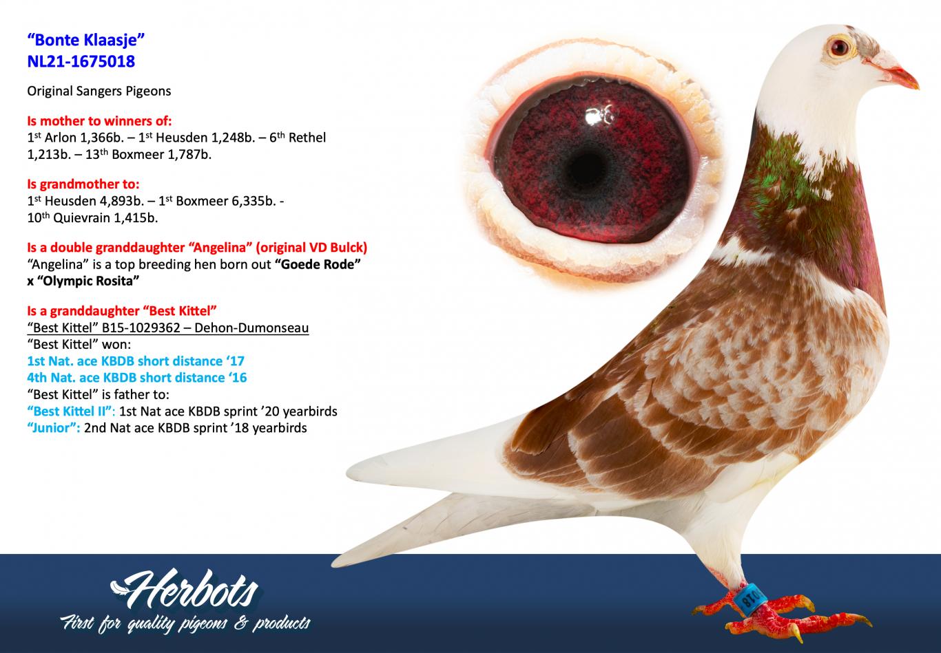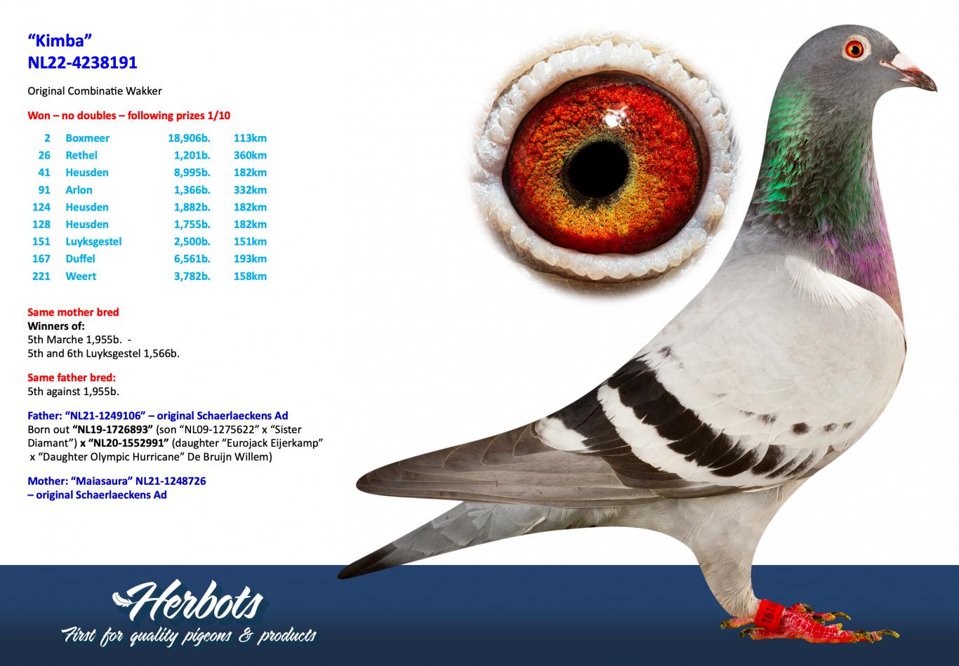 Won: 1st National Ace Pigeon KBDB young birds and bred in two generations: