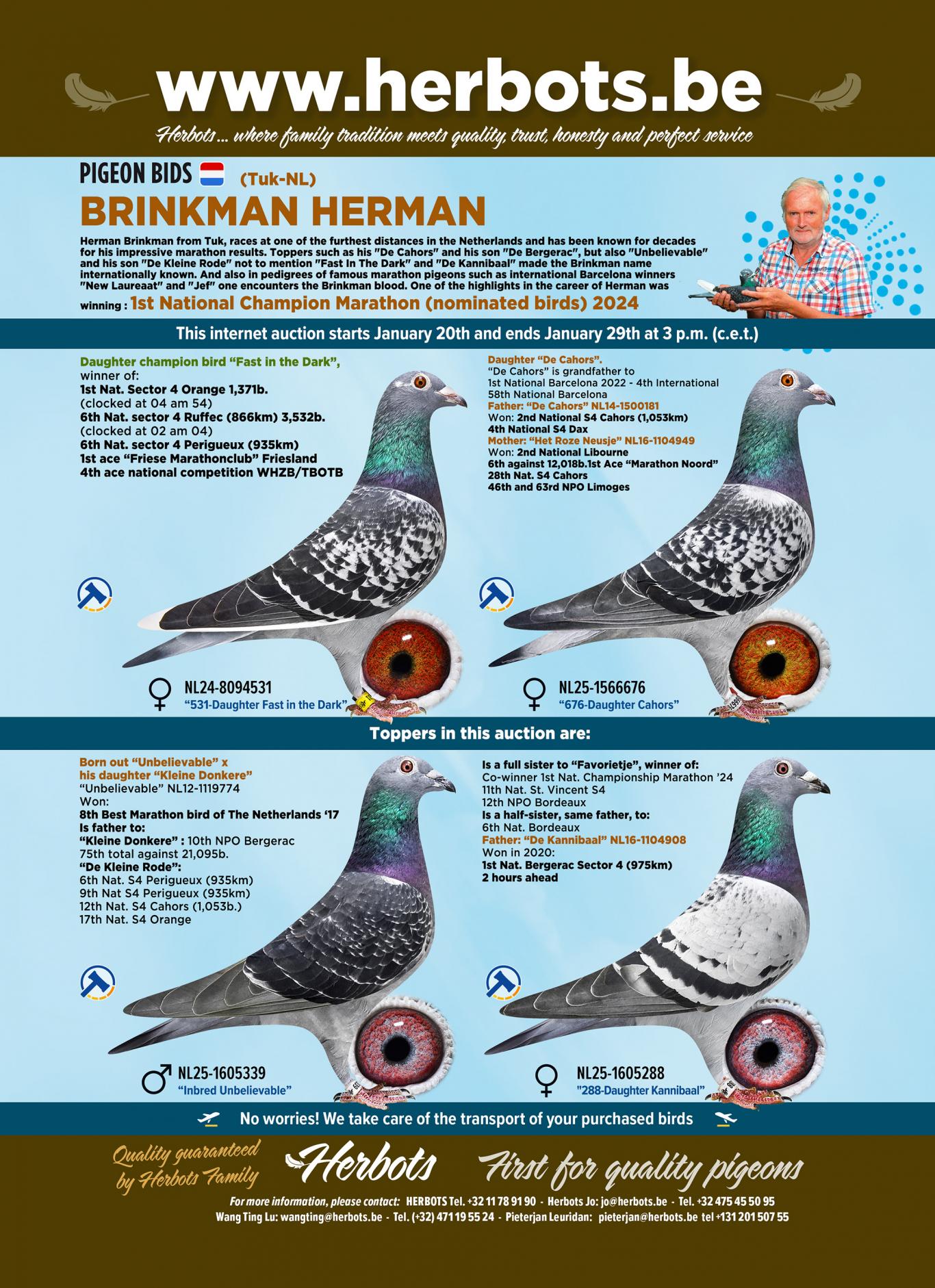 Dans la colombophilie néerlandaise, le nom de Herman Brinkman est synonyme d'excellentes performances dans les courses de marathon. Depuis sa ville natale de Tuk, située dans l'Overijssel, il est devenu l'un des colombophiles les plus respectés dans le domaine des grandes distances. Les immenses distances de vols tels que Barcelone (1 308 km), St Vincent (1 153 km), Cahors (1 053 km), Agen (1 053 km) et Périgueux (935 km) requièrent des pigeons d'une persévérance à toute épreuve. Les pigeons Brinkman ont prouvé à maintes reprises qu'ils étaient capables d'effectuer ces vols.