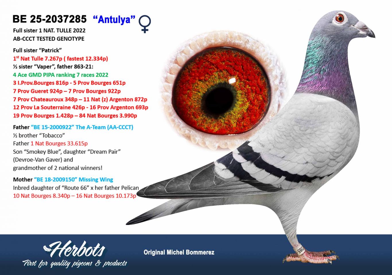 Ce sont les parents de « Carina », 1re Nationale Bourges 33,615 pigeons et la plus rapide sur 57,621 pigeons en 2022. Cette femelle d'exception a également remporté la 4 Nat (z) Issoudun 2,145p – 18 I.Prov Bourges 1,120p – 30 Nat (z) La Souterraine 809p.