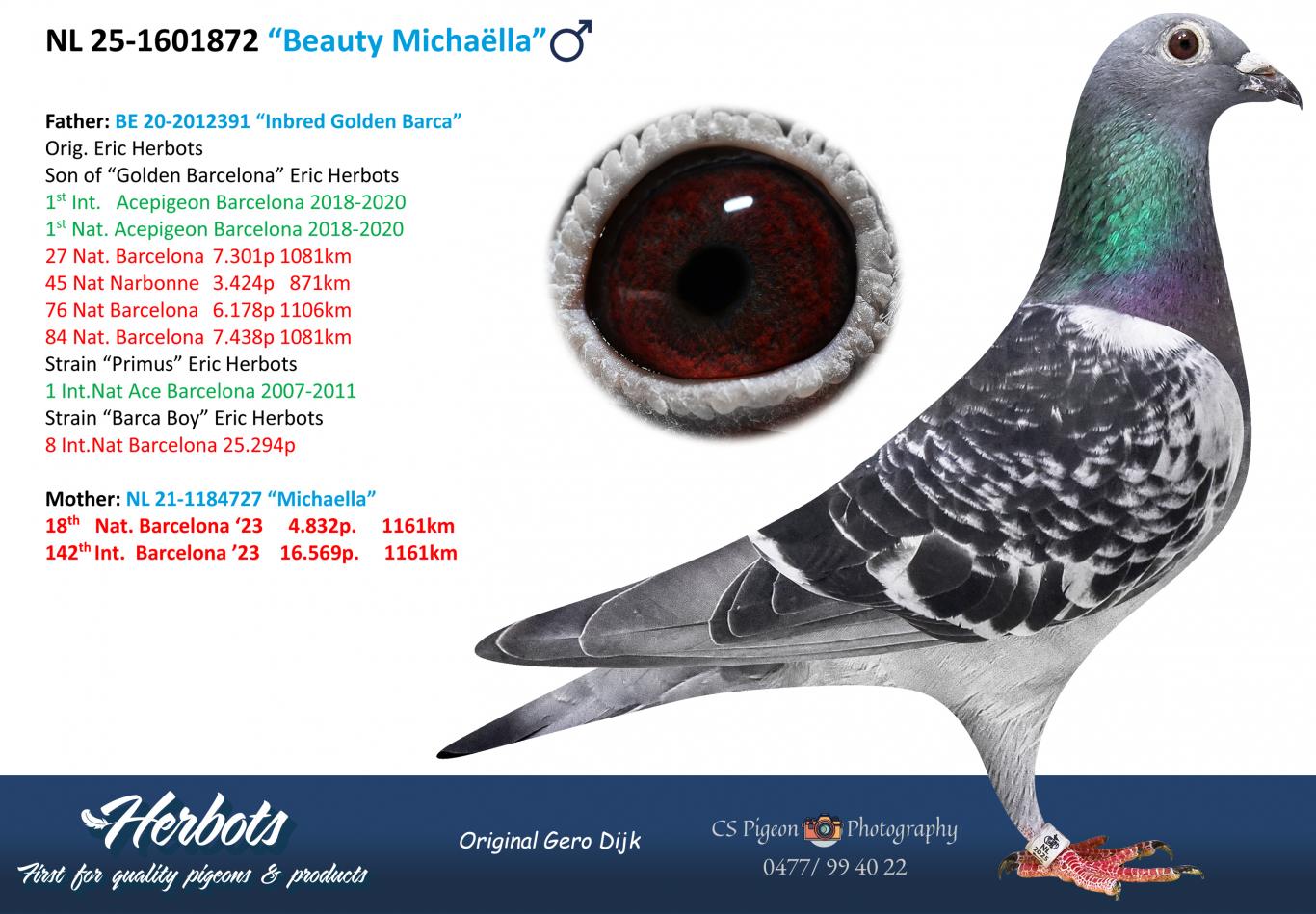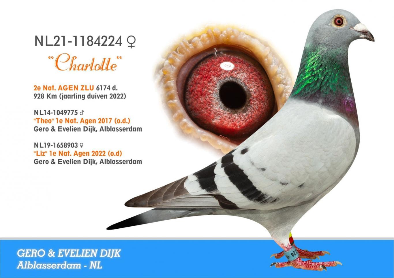 Cette pigeonne prodigieuse a elle-même remporté le 1er National Agen Vieux 2022contre 6 146 pigeons, après un vol éprouvant de plus de 11,5 heures. Cette année-là, l'histoire s'est écrite : le père « Theo », la mère « Liz » et la fille « Charlotte » ont brillé au plus haut niveau.