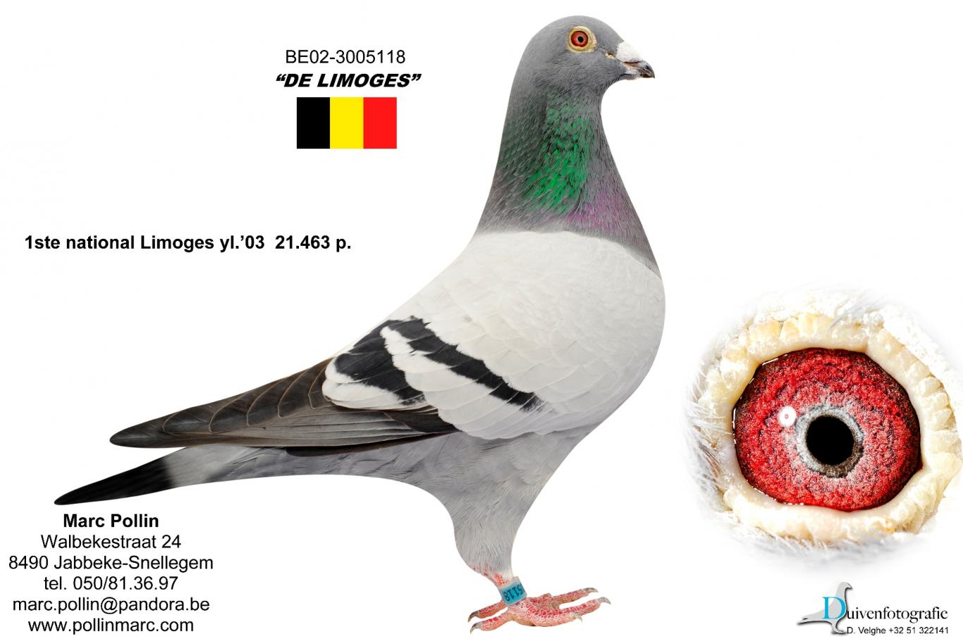 Concours national de Limoges pour les yearlings. Le classique du début des années 2000. À cette époque, le programme d'entraînement des yearlings était légèrement allégé, et Limoges constituait l'épreuve finale pour tous les pigeons de fond de l'année. Il ne s'agissait pas d'être autorisé à concourir, mais d'être tenu de performer. Limoges était le concours de sélection. C'est pourquoi les yearlings de Limoges attiraient toujours un grand nombre de participants, et en 2003, pas moins de 21 463 yearlings étaient présents au lâcher. Lâché à 6 h 50, « B02-3005118 » (rebaptisé plus tard « De Limoges ») a impressionné tout le monde avec une vitesse moyenne de 1 141,86 m/min. « De Limoges »… un magnifique mâle bleu… issu d'un croisement entre les meilleures lignées de « De Vooruit » et de « De Perpignan ».