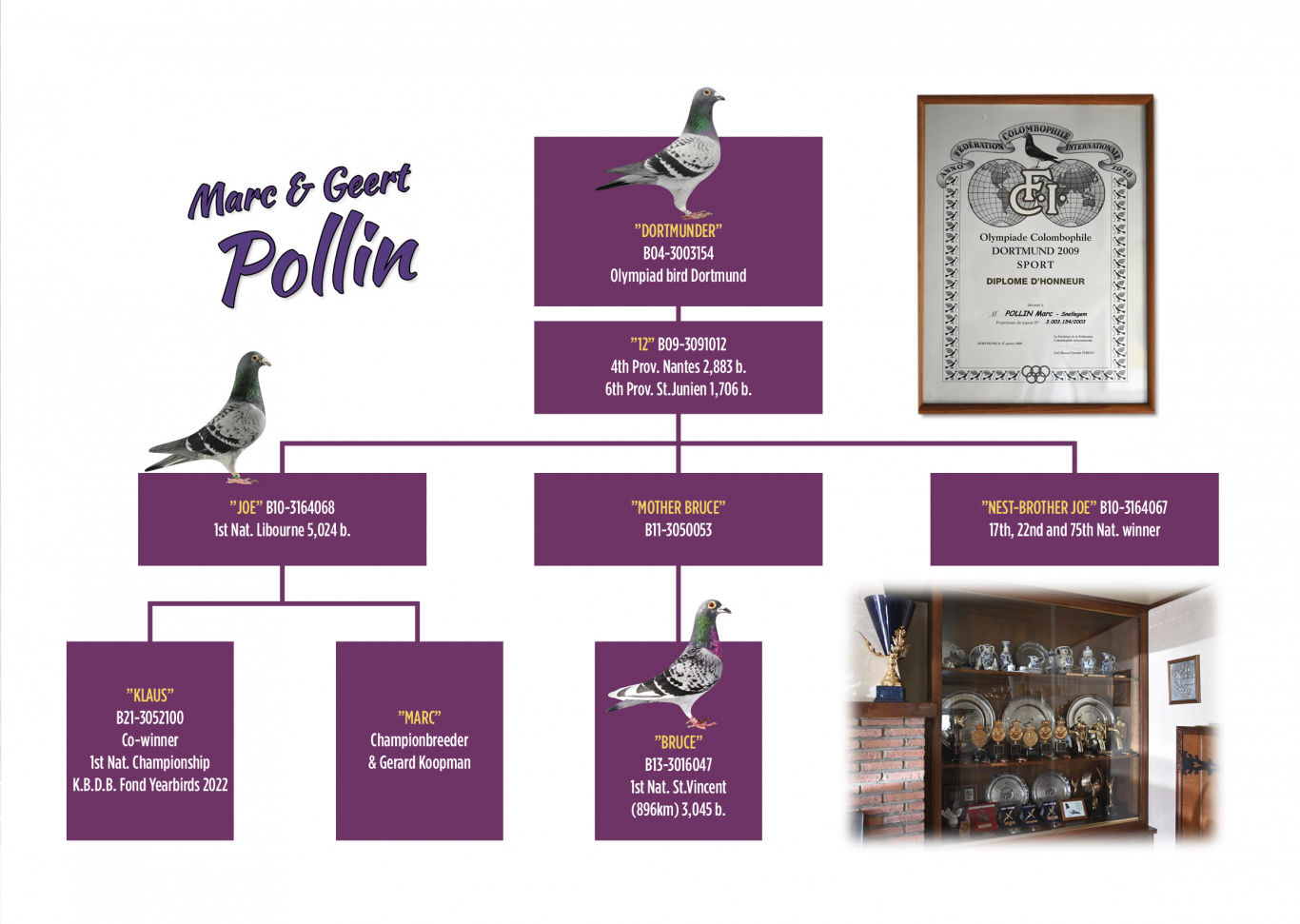 « Bruce » est le grand-père de Koopman, vainqueur du 9e prix de la finale du concours OLR de Pattaya, et de « Coby » : 1er à Dries-Bruck (17 461 pigeons), 1er à Sourdun (5 475 pigeons, le plus rapide sur 12 000 pigeons) et 1er à Sens (1 290 pigeons).
