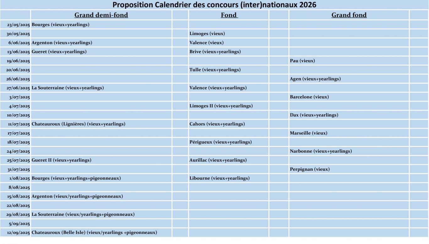 - Concours internationaux de grand fond : Le calendrier correspondant a été repris tel qu’appliqué les années précédentes.