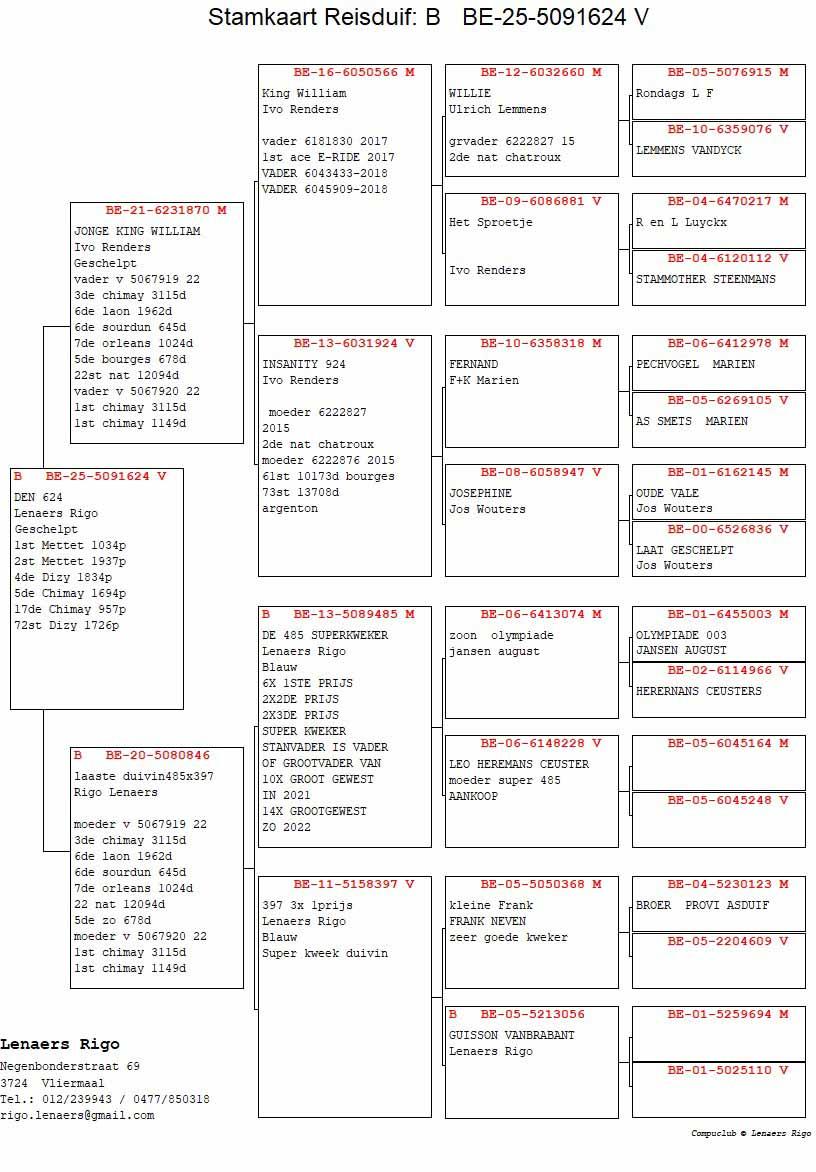 La première course de la colonie de Rigo Lenaers a débuté de façon fantastique. Mâles et femelles ont été enlogés, seuls les mâles d'un an restant au colombier. Six pigeons ont été constatés simultanément en moins de 12 secondes, ce qui les place au 6e rang des plus rapides sur près de 2 000 pigeons. Pour Rigo, c'est un départ fantastique après son excellente saison de l'année dernière. Le premier pigeon est un mâle, fils du meilleur couple reproducteur de Rigo ; le second est une femelle d'un an. Cette dernière, née tardivement, avait été enlogée 7 fois l'année dernière et avait déjà montré un grand potentiel. De plus, la quasi-totalité des pigeons descendent du reproducteur fondateur « Super 485 », petit-fils d'« Olympiade 003 » Leo Heremans.