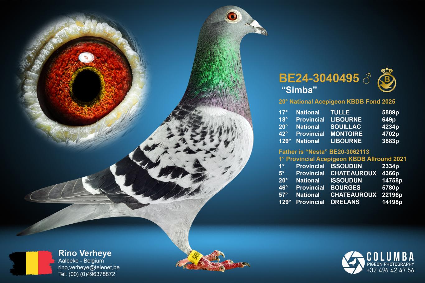 Rino Verheye et Miranda, d'Aalbeke en Flandre-Occidentale, réalisent d'excellentes performances année après année, et ce, dans toutes les disciplines. Bien qu'ils privilégient les concours nationaux, il faut également les prendre en compte sur les concours plus courts au départ de Clermont. Véritable équipe polyvalente, ils peuvent concourir sur des distances allant jusqu'à 700 km. Leur écurie repose en grande partie sur le couple reproducteur « Benny Hill » x « Emillia » et leur championne « Jommeke », double As Pigeon Provincial Toutes Catégories KBDB. Rino et Miranda sont convaincus que la performance en compétition déterminera quels pigeons rejoindront leur colombier de reproduction ; la compétition est donc essentielle, et leur objectif est de démontrer leur potentiel lors des concours les plus prestigieux.