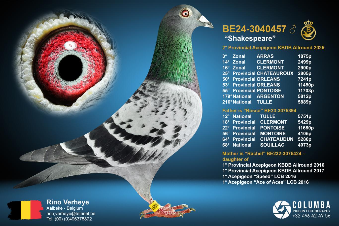 Grand-père de 413/24 “Shogun” 17 Prov Fontenay 9,406p – 20 Prov Orleans 4,731p – 25 Prov Pontoise 11,703p – 35 Nat Souillac 4,234p – 62 Prov Orleans 3,516p Grand-père de 457/24 “Shakespeare” 2 Prov As Pigeon All Round RFCB 2025 – 3 Arras 1,875p – 14 Clermont 2,499p – 16 Clermont 2,900p – 25 Prov Chateauroux 2,805p – 50 Prov Orleans 7,241p – 53 Prov Orleans 11,450p – 55 Prov Pontoise 11,703p