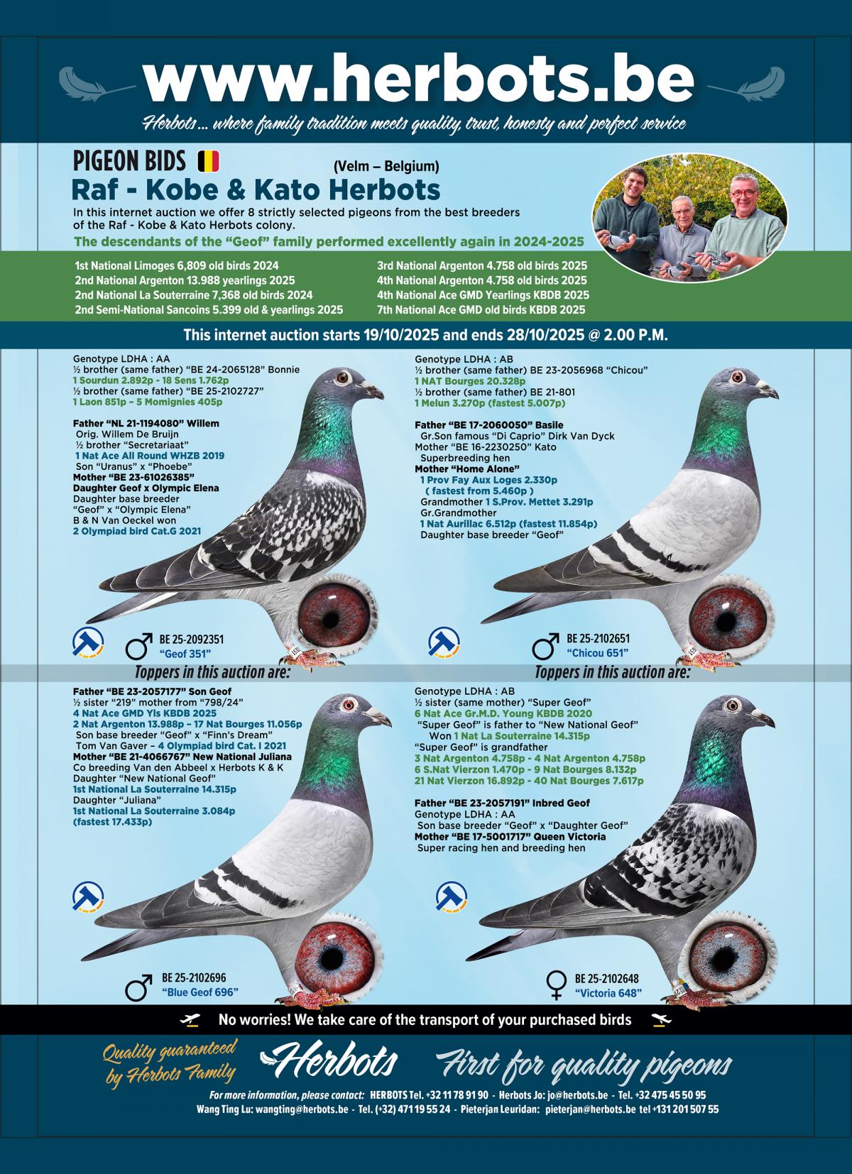 Dans cette vente aux enchères sur Internet, nous proposons 9 pigeons strictement sélectionnés parmi les meilleurs éleveurs de la colonie Raf - Kobe & Kato Herbots.