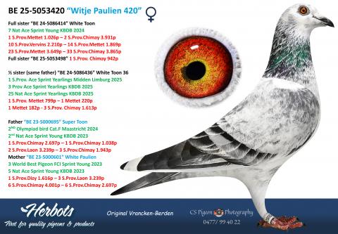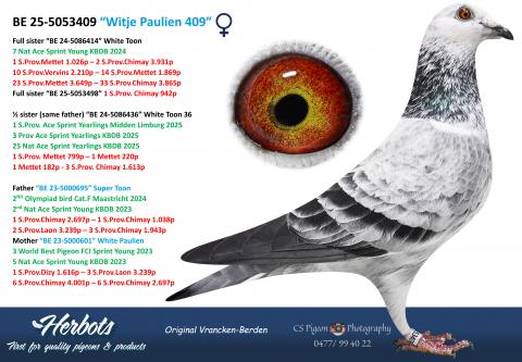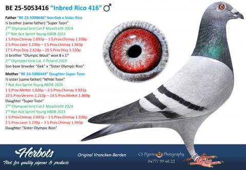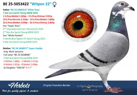 Dans cette vente aux enchères sur Internet, nous proposons 10 meilleurs pigeons directs de la colonie Vrancken - Berden. Une colonie qui a dominé les compétitions de vitesse avec de jeunes pigeons ces dernières années et qui est connue dans le monde entier avec « White Man » et la famille « Olympic Rico ».