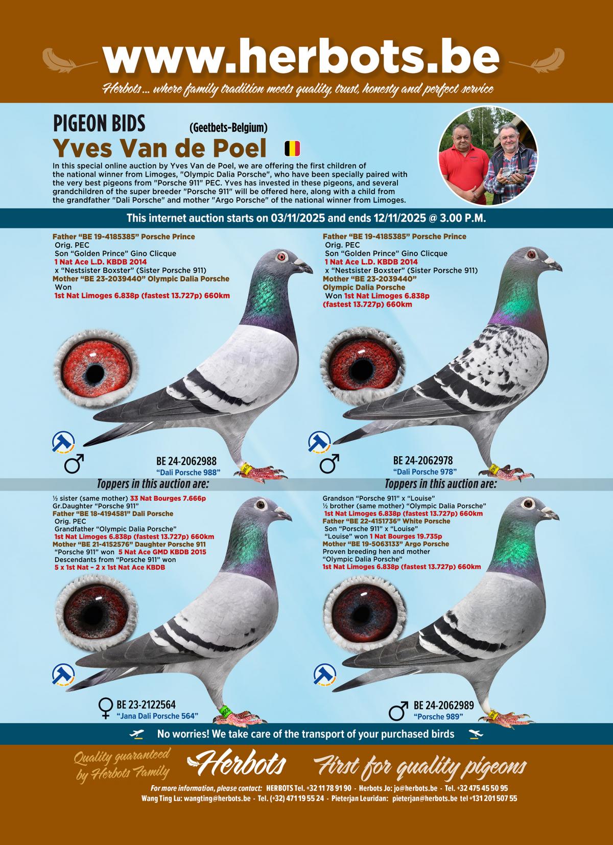 Lors de cette vente en ligne spéciale organisée par Yves Van de Poel, nous proposons le premier rejeton de la gagnante nationale de Limoges, « Olympic Dalia Porsche », accouplée spécialement avec les meilleurs pigeons de « Porsche 911 » PEC. Yves a investi dans ces pigeons et proposera plusieurs petits-enfants de la super-reproductrice « Porsche 911 », ainsi qu'un enfant issu du grand-père « Dali Porsche » et de la mère « Argo Porsche » de la gagnante nationale de Limoges.