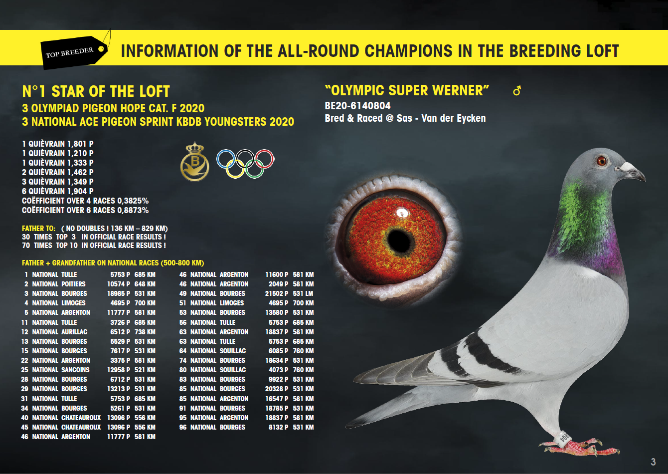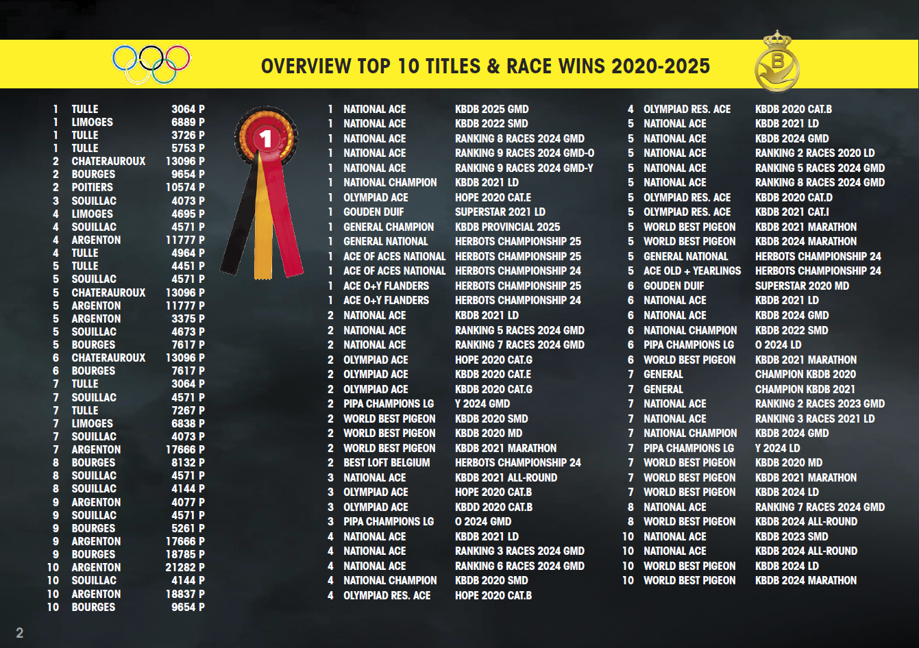 Top-kandidaat Olympiade duif in 5 verschillende categorieën