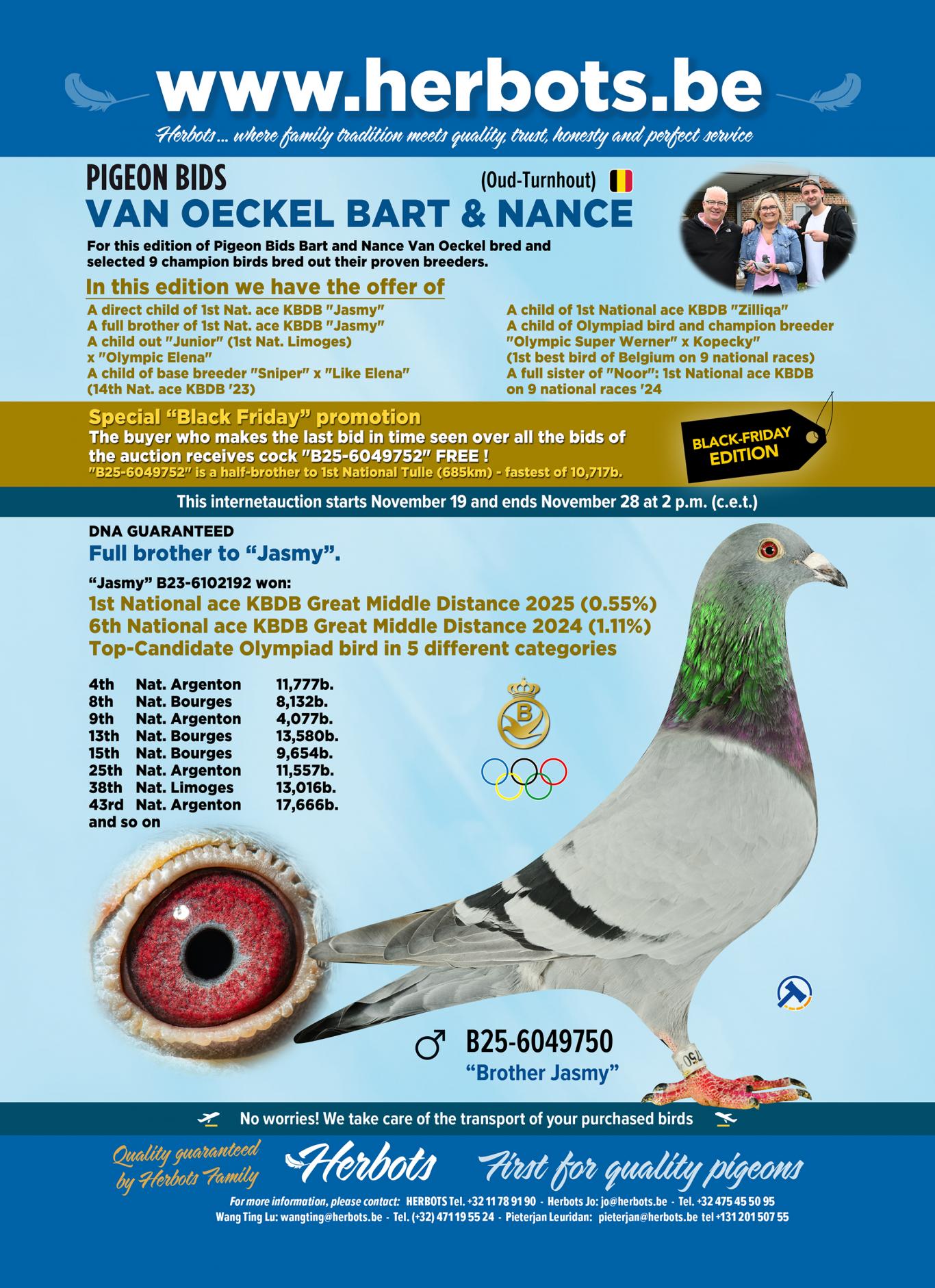 De koper welke - over heel de looptijd van deze verkoop gezien - het laatste bod maakt, ontvangt duiver "B25-6049752" GRATIS !
