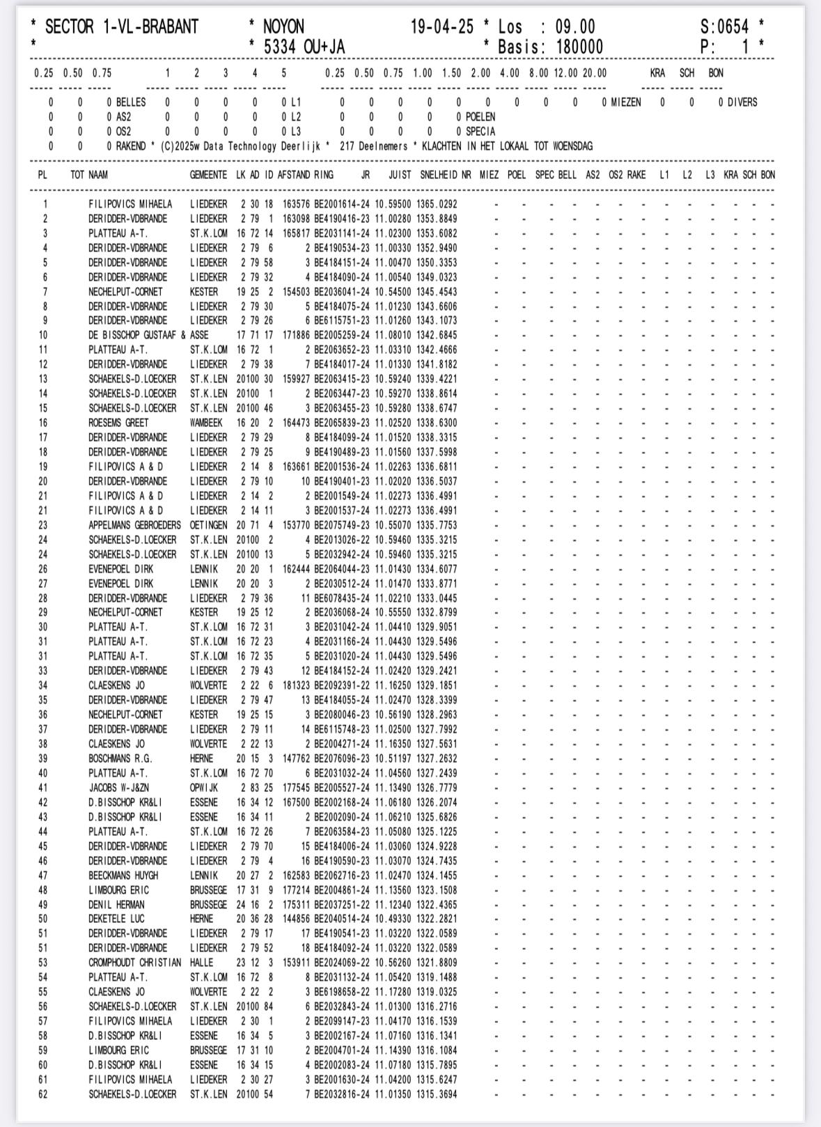 Ook met de jonge duiven worden er knaluitslagen op papier gezet. Als voorbeeld nemen we de uitslag van 6/09/25. Noyon 1.750 jonge duiven – 85 mee: