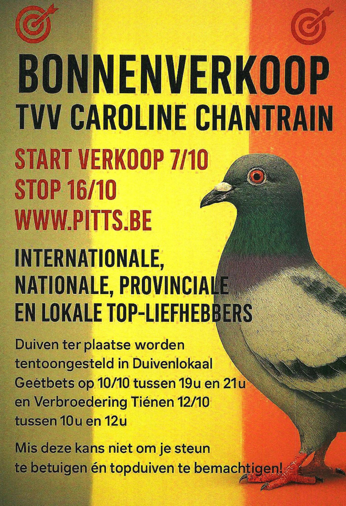Duivenliefhebbers Gerda Vanheer, van tandem Stefaan & Gerda Anthoons, Freddy Claes van Hok Claes, en Gunther Laeremans starten zo’n bonnenverkoop ten voordele van Caroline Chantrain. Caroline kreeg vorig jaar te horen dat ze uitgezaaide pancreaskanker heeft. Ze wordt bij haar ziekte ondersteund door haar zesjarige dochtertje, haar man, familie en vrienden