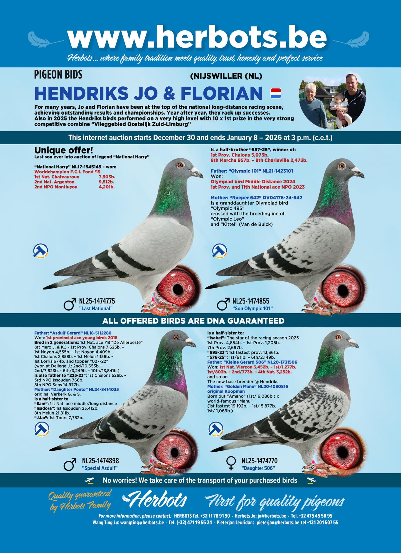 Speciaal voor internetverkoop Pigeon Bids, kweekte en selecteerden Jo en Florian een prachtige groep 2025-duiven uit hun allerbeste duiven, waarbij het laatste kind uit "National Harry" ooit nog aangeboden door Jo & Florian.