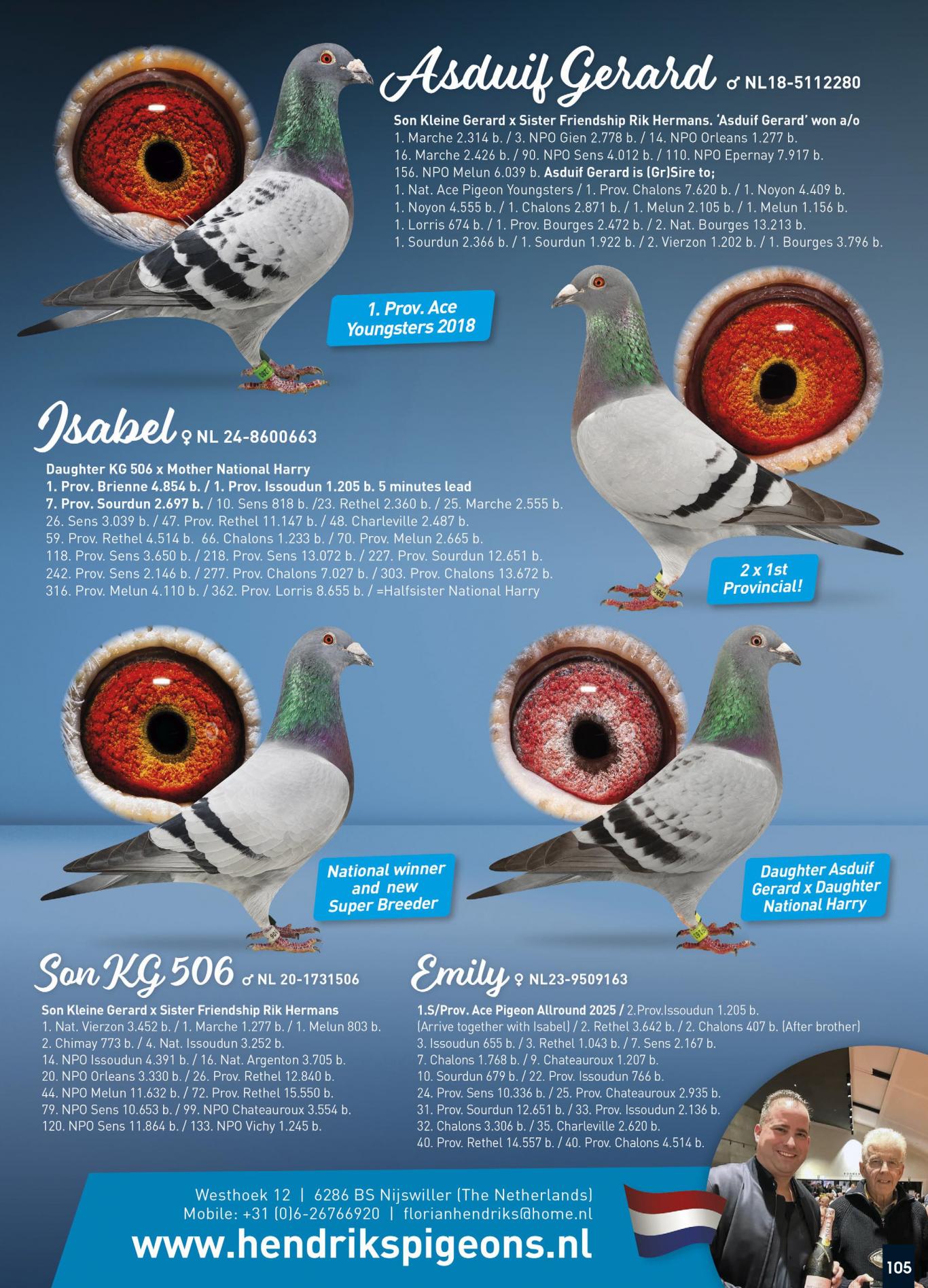 De recentste topduif is “24-663” (uit supervlieger “Kleine Gerard 506” x “Moeder National Harry”) vernoemd naar zijn dochtertje “Isabel” en “663” won in 2025 o.a.