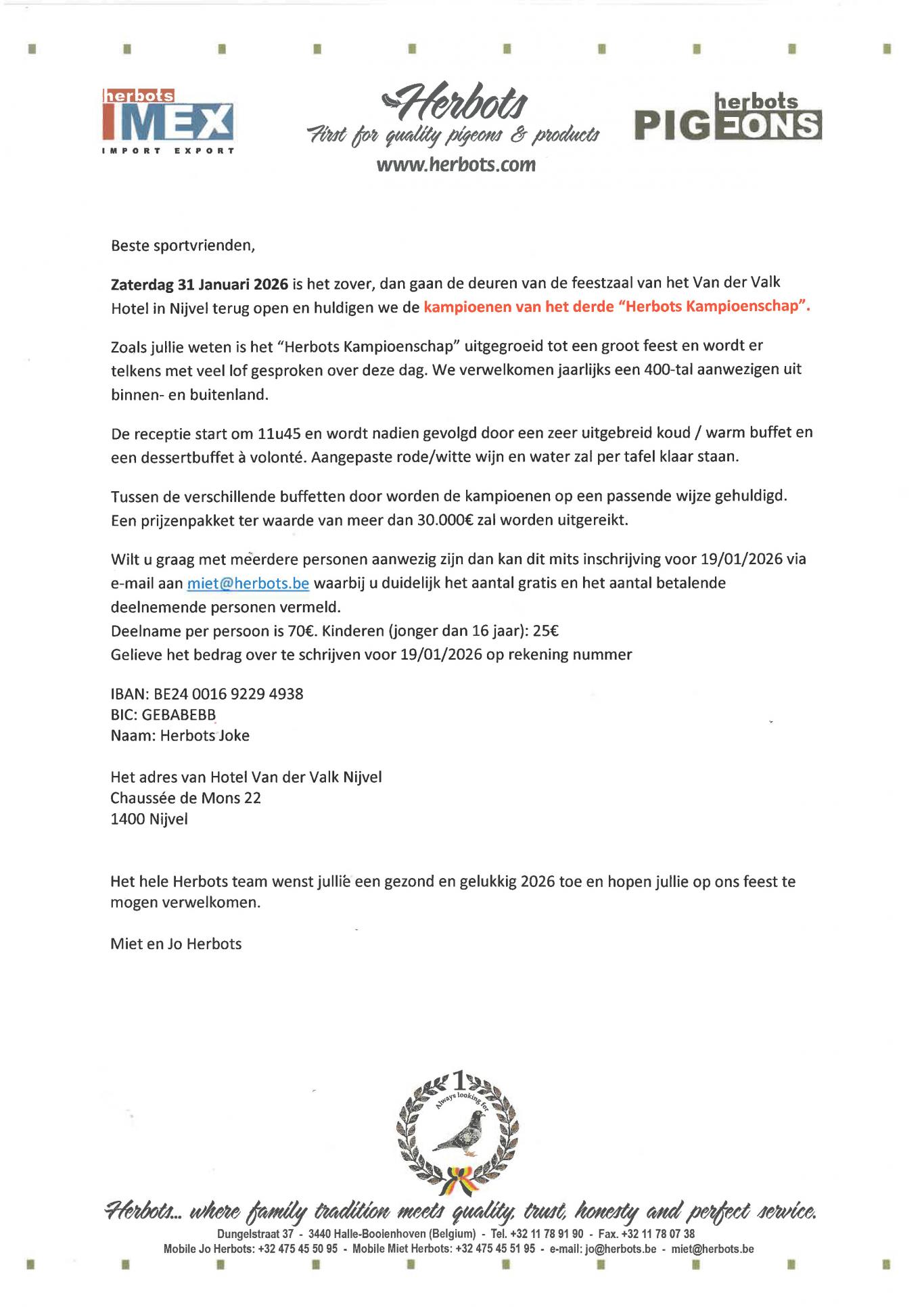 Zoals jullie weten is het “Herbots Kampioenschap” uitgegroeid tot een groot feest en wordt er telkens met veel lof gesproken over deze dag. We verwelkomen jaarlijks een 400-tal aanwezigen uit binnen- en buitenland.