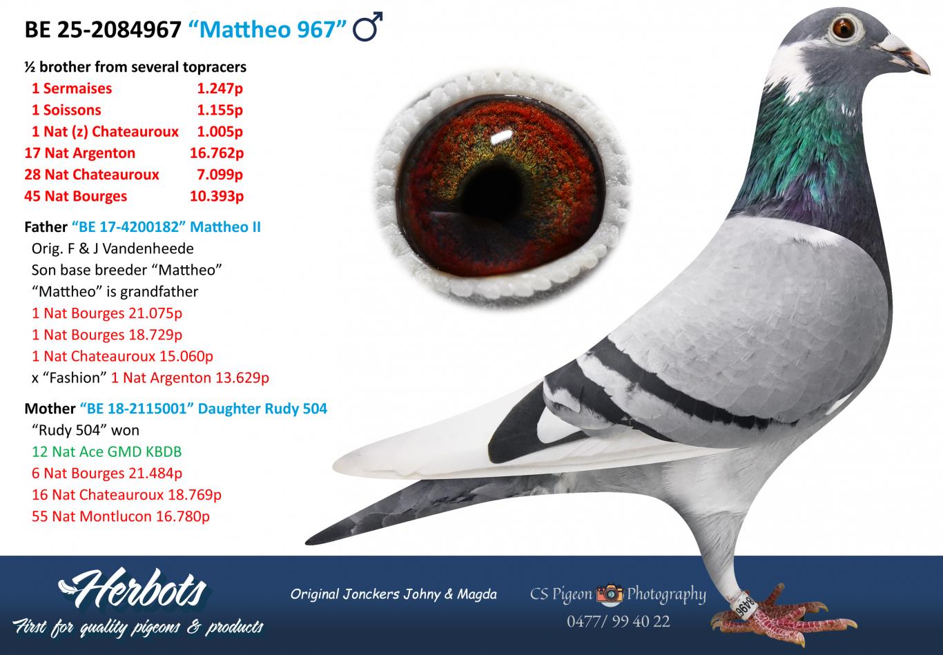 Zoon van “182/17” Mattheo II F & J Vandenheede x “370/13” Dochter 801 is superkweekduivin en moeder van 7 Nat Argenton 22.712d -29 Nat Chateauroux 14.953d