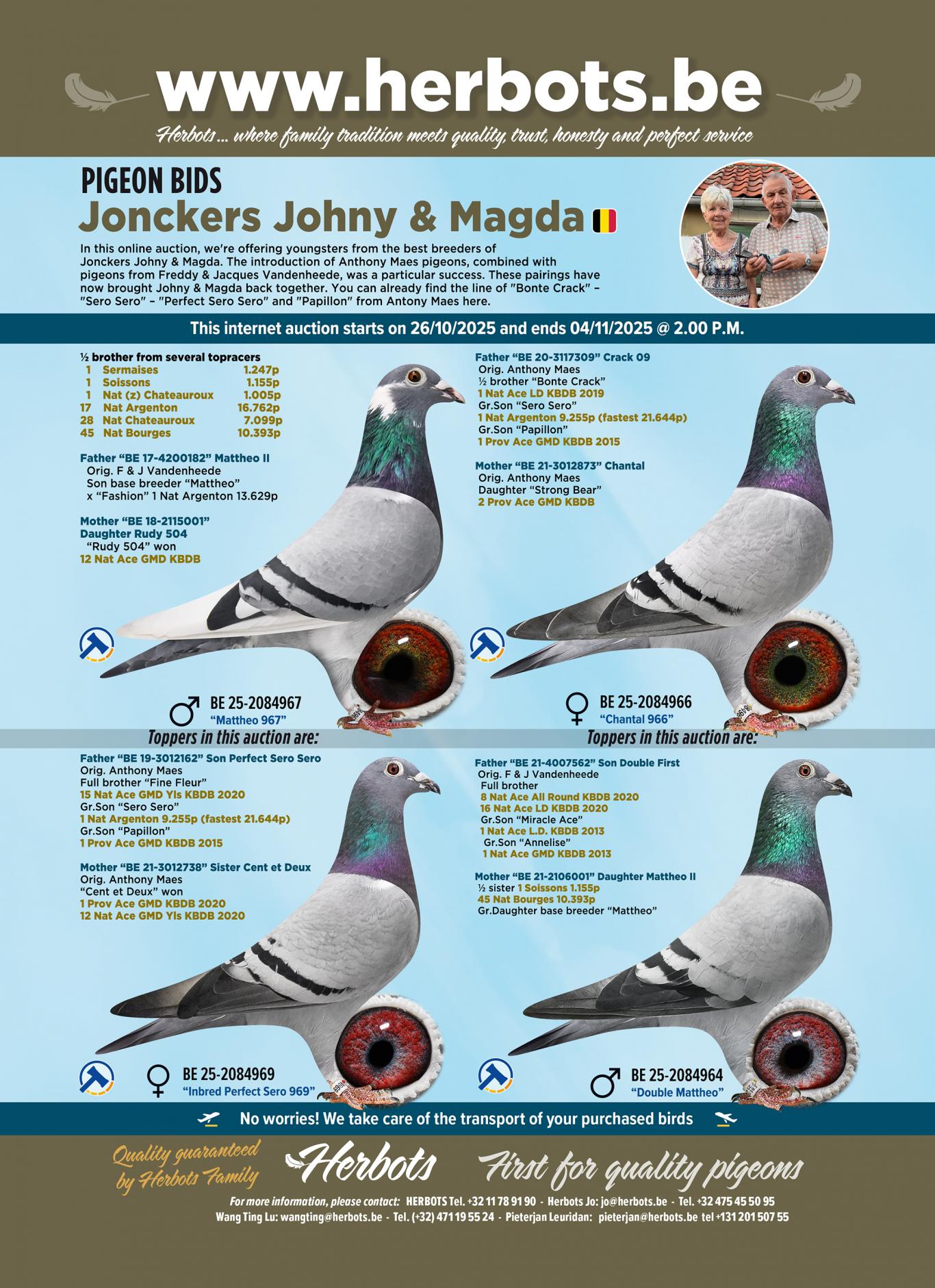 Nu in deze pigeon bids editie brengen Johny en Magda jonge duiven 2025 uit de beste duiven van Athony Maes samen met enkele kinderen uit zijn beste kwekers. Morgen 04 November om 14u00 eindigt deze veiling