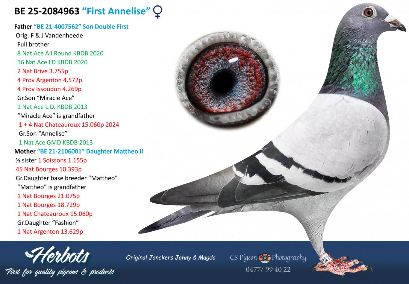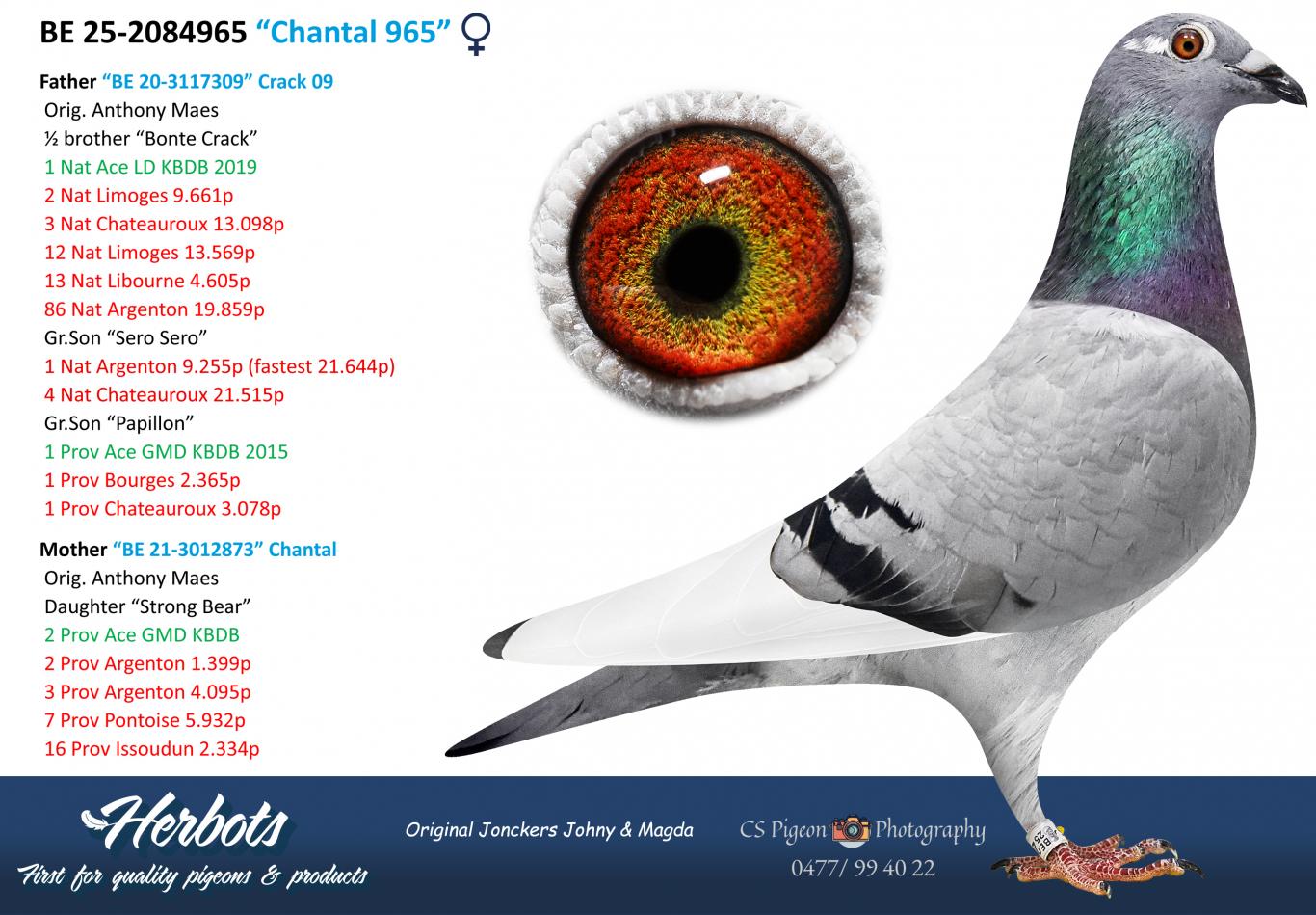 Dochter van “890/22” Supreme won 1 Nat Tulle 6.206d – 2 Nat Argenton 11.838d en superkweker ten huize Herbots x “491/19” Zus Rudy 504 die won 12 Nat Asduif zware halve fond KBDB