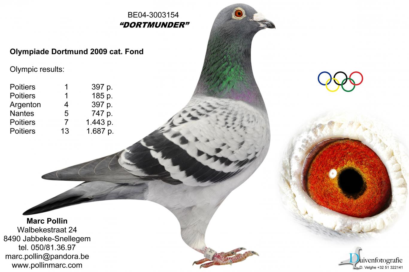 Zijn naam heeft inderdaad een link naar de Duitse stad Dortmund waar in 2009 de duivenolympiade plaats vond. In de categorie “Fond” mocht “Dortmunder” (B04-3003154) België vertegenwoordigen en nadien kreeg hij een kweekbox te Snellegem toegewezen. “Dortmunder” ontgoochelde niet en nu nog komen we in de stamkaarten van veel belangrijke Pollin duiven zijn naam tegen.